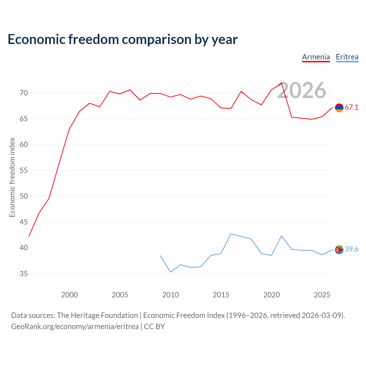 The Economic Freedom Index for Armenia is 67.1, ranking 58/197, compared to 39.6 for Eritrea, ranking 188/197. The chart above displays a comparison of annual changes in economic freedom indexes.