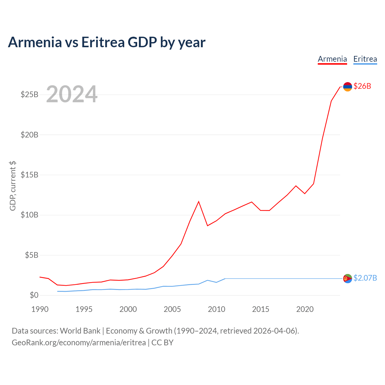 Armenia has a GDP of $26B compared to $2.07B for Eritrea, ranking 114/197 and 179/197 by economy size, respectively.