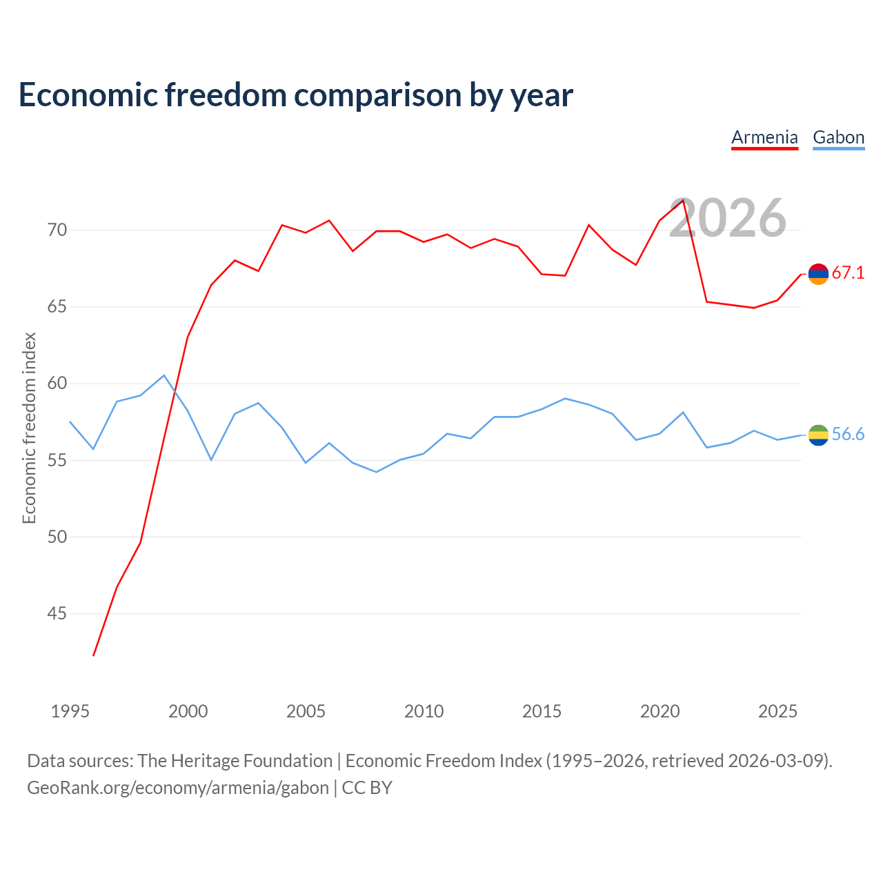 The Economic Freedom Index for Armenia is 67.1, ranking 58/197, compared to 56.6 for Gabon, ranking 120/197. The chart above displays a comparison of annual changes in economic freedom indexes.