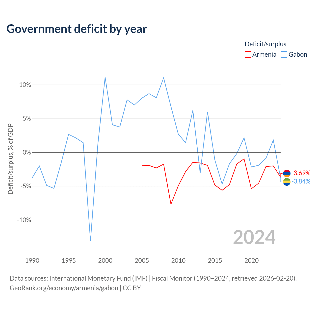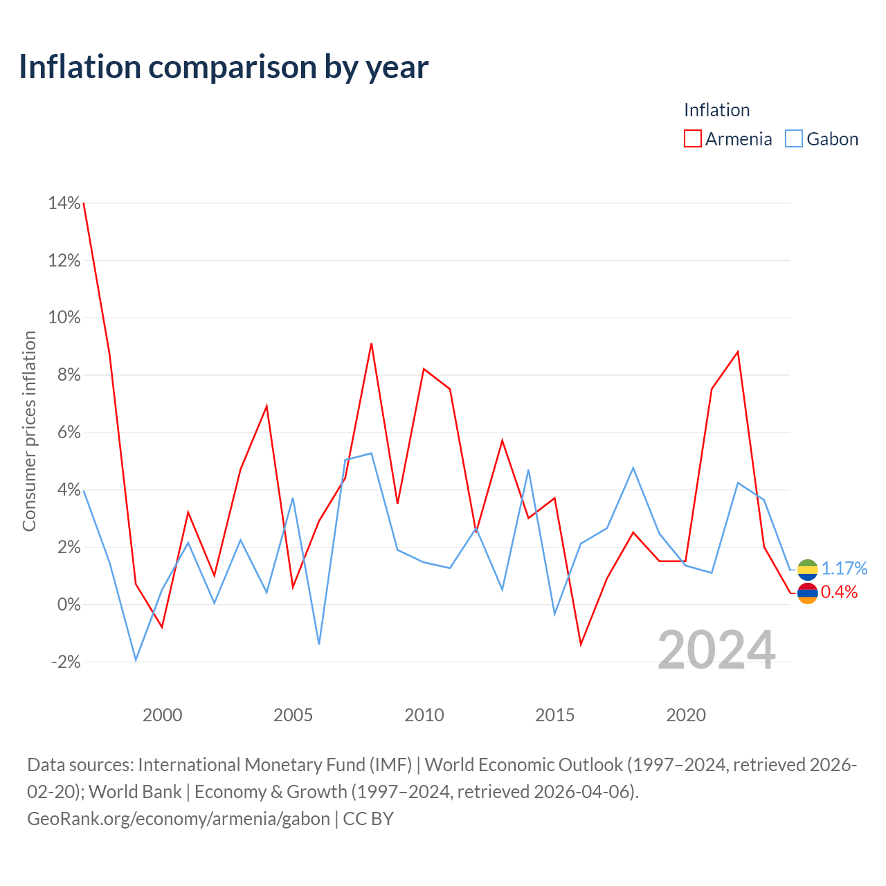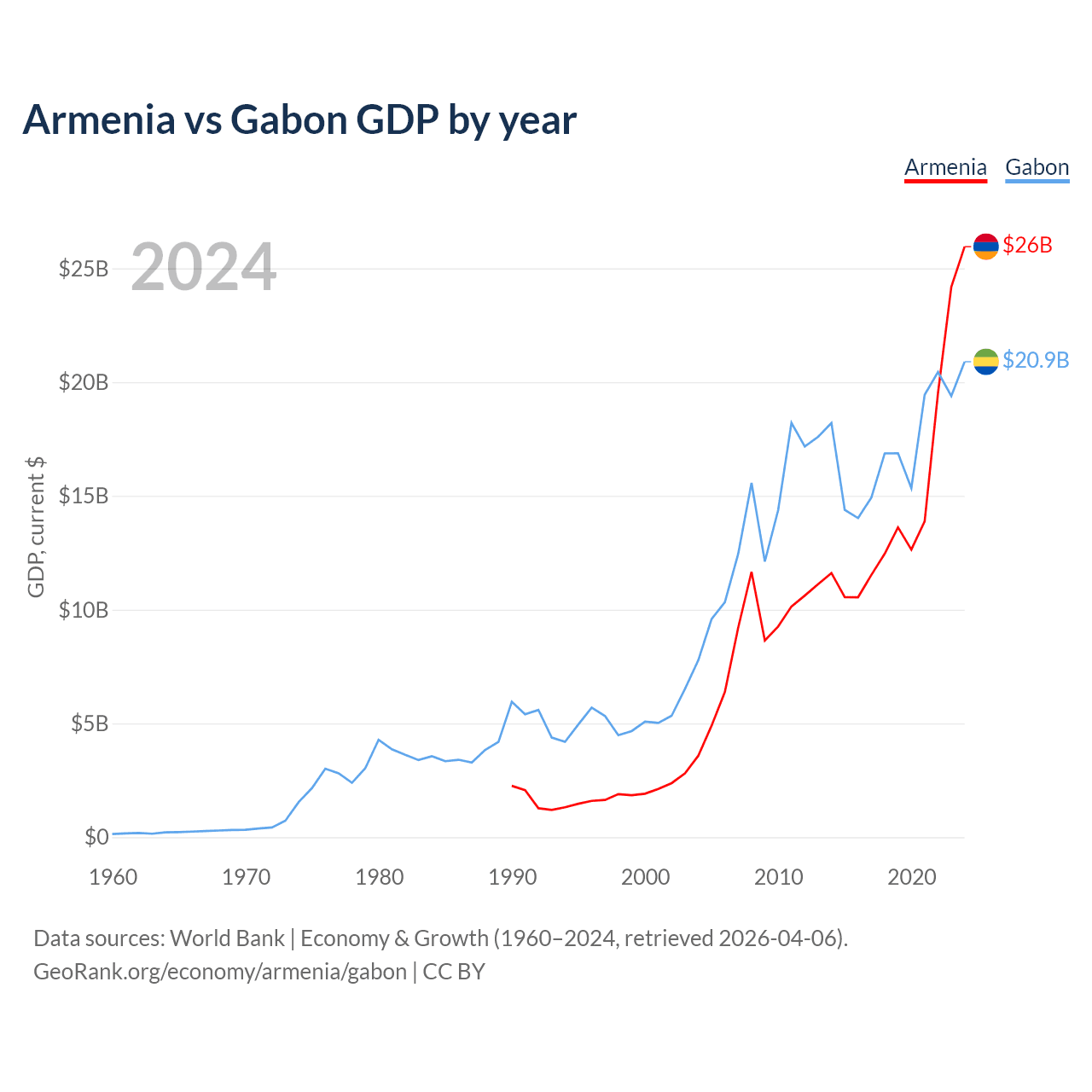 Armenia has a GDP of $26B compared to $20.9B for Gabon, ranking 114/197 and 127/197 by economy size, respectively.