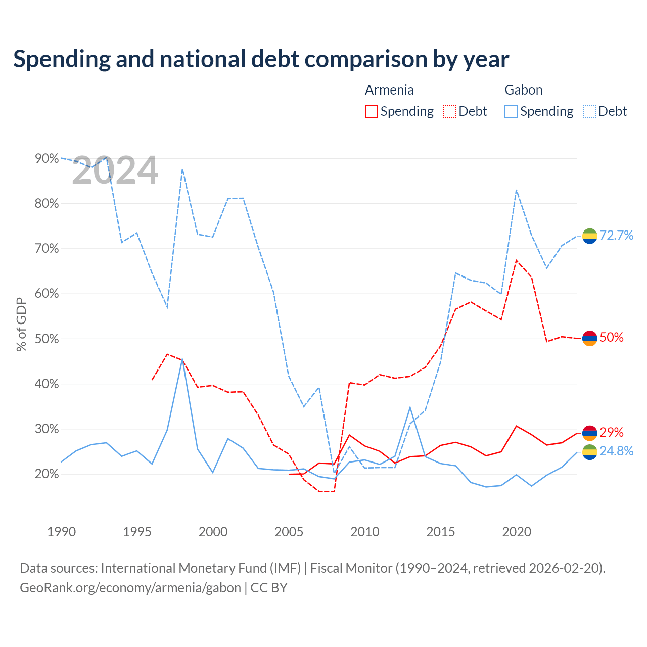 Armenia has $13B in government debt (50% of GDP), compared to $15.2B (72.7% of GDP) in Gabon.