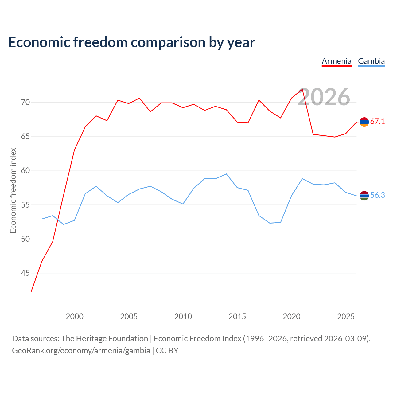 The Economic Freedom Index for Armenia is 67.1, ranking 58/197, compared to 56.3 for the Gambia, ranking 123/197. The chart above displays a comparison of annual changes in economic freedom indexes.