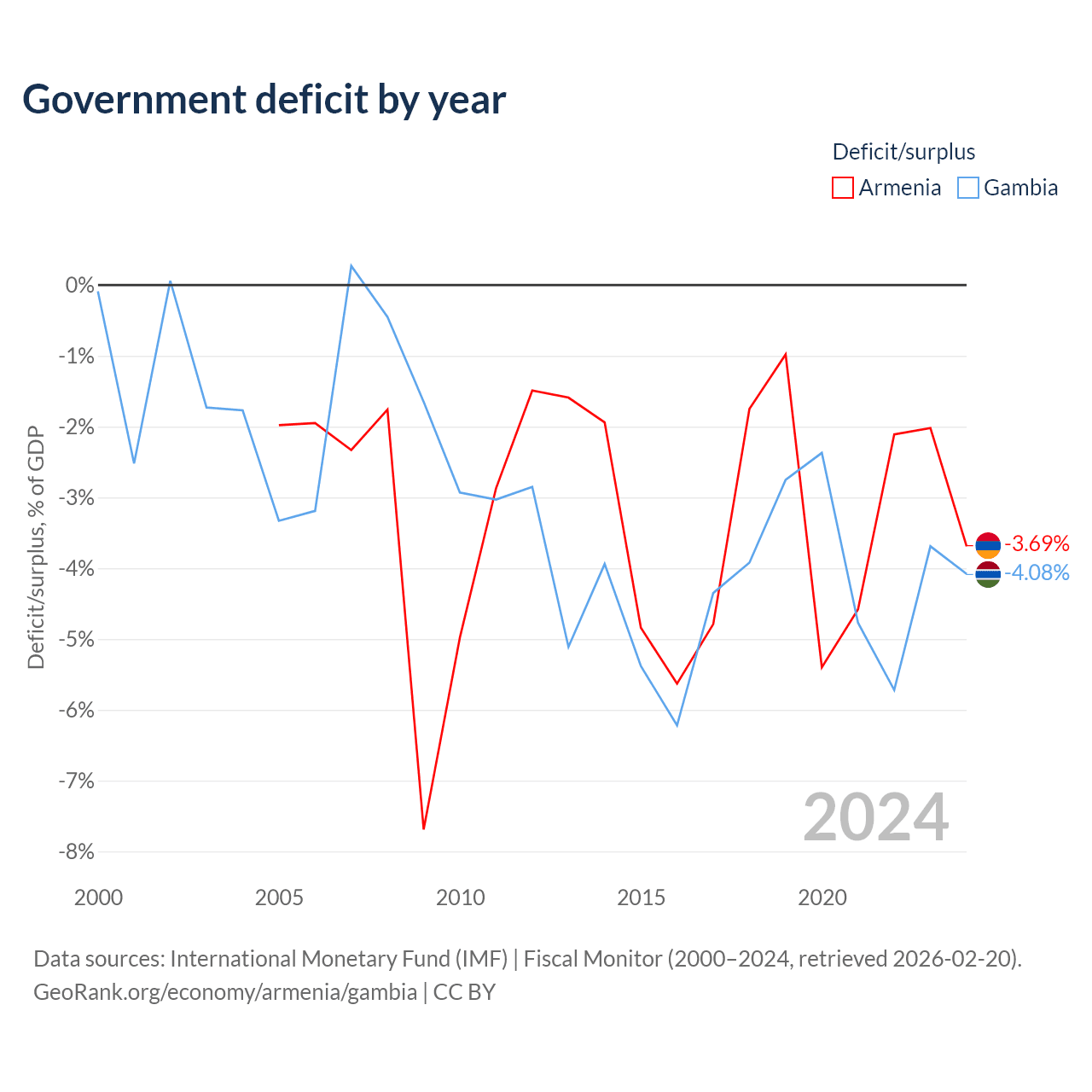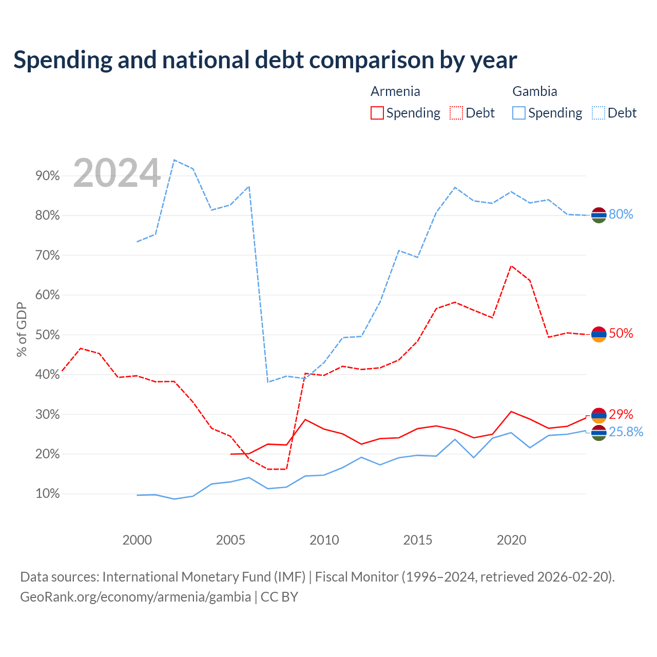 Armenia has $13B in government debt (50% of GDP), compared to $1.92B (80% of GDP) in the Gambia.