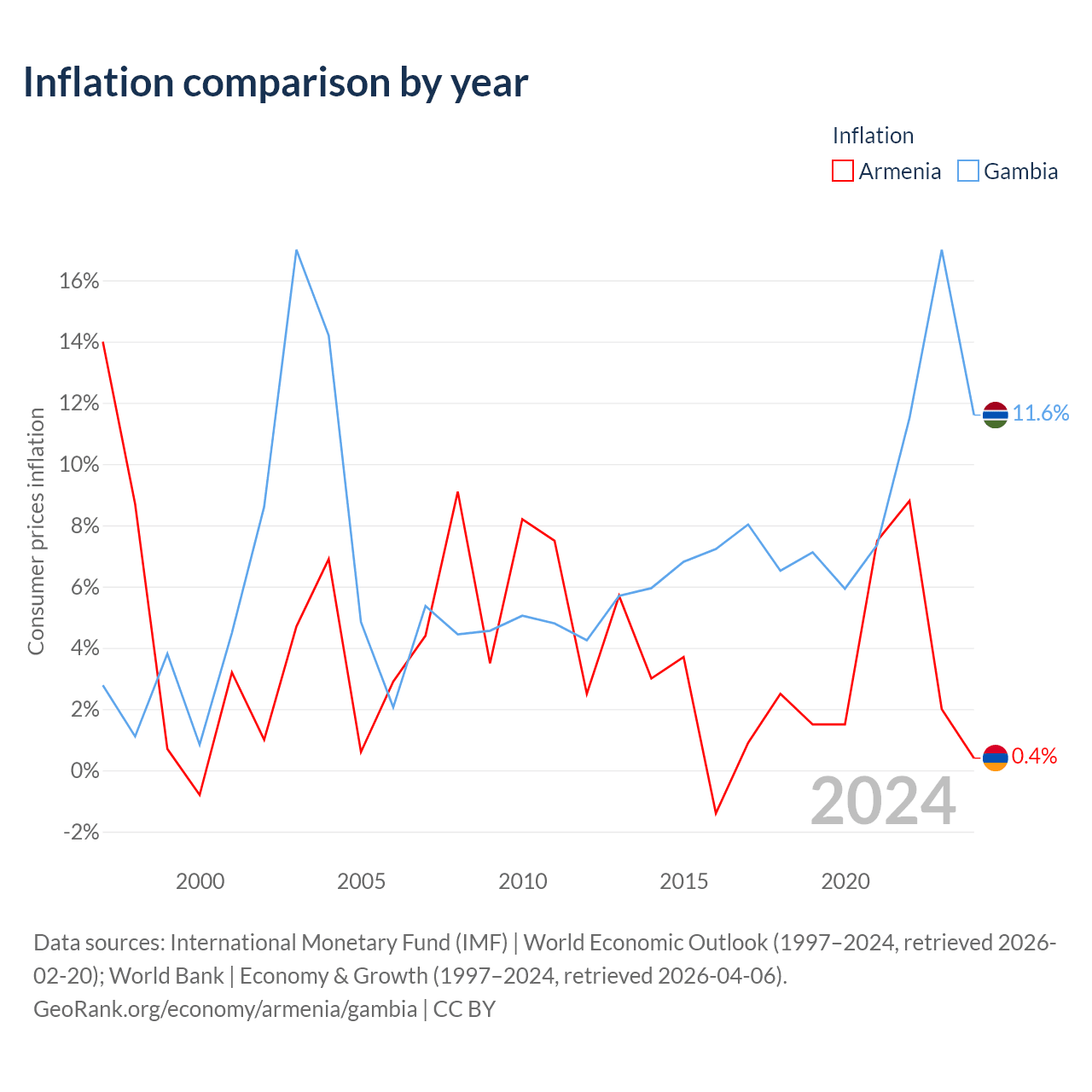 Armenia has a GDP of $26B compared to $2.4B for the Gambia, ranking 114/197 and 174/197 by economy size, respectively.