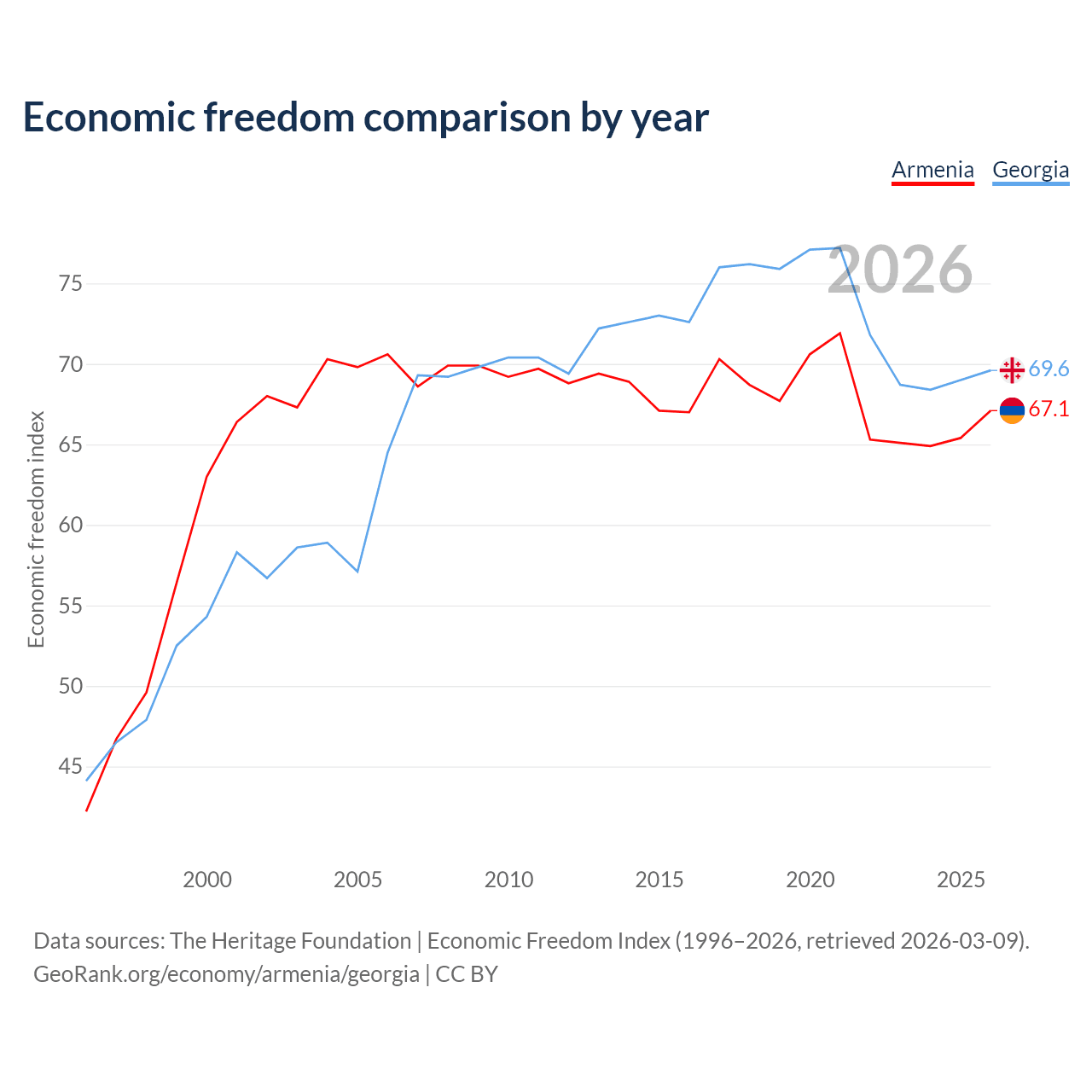 The Economic Freedom Index for Armenia is 67.1, ranking 58/197, compared to 69.6 for Georgia, ranking 41/197. The chart above displays a comparison of annual changes in economic freedom indexes.