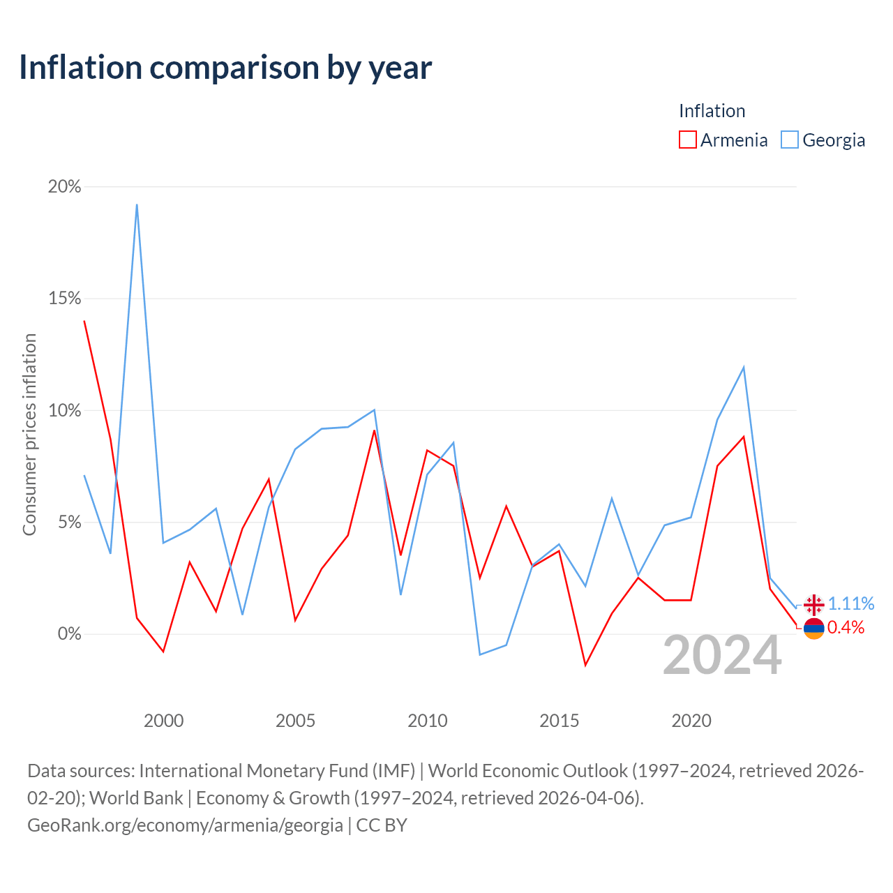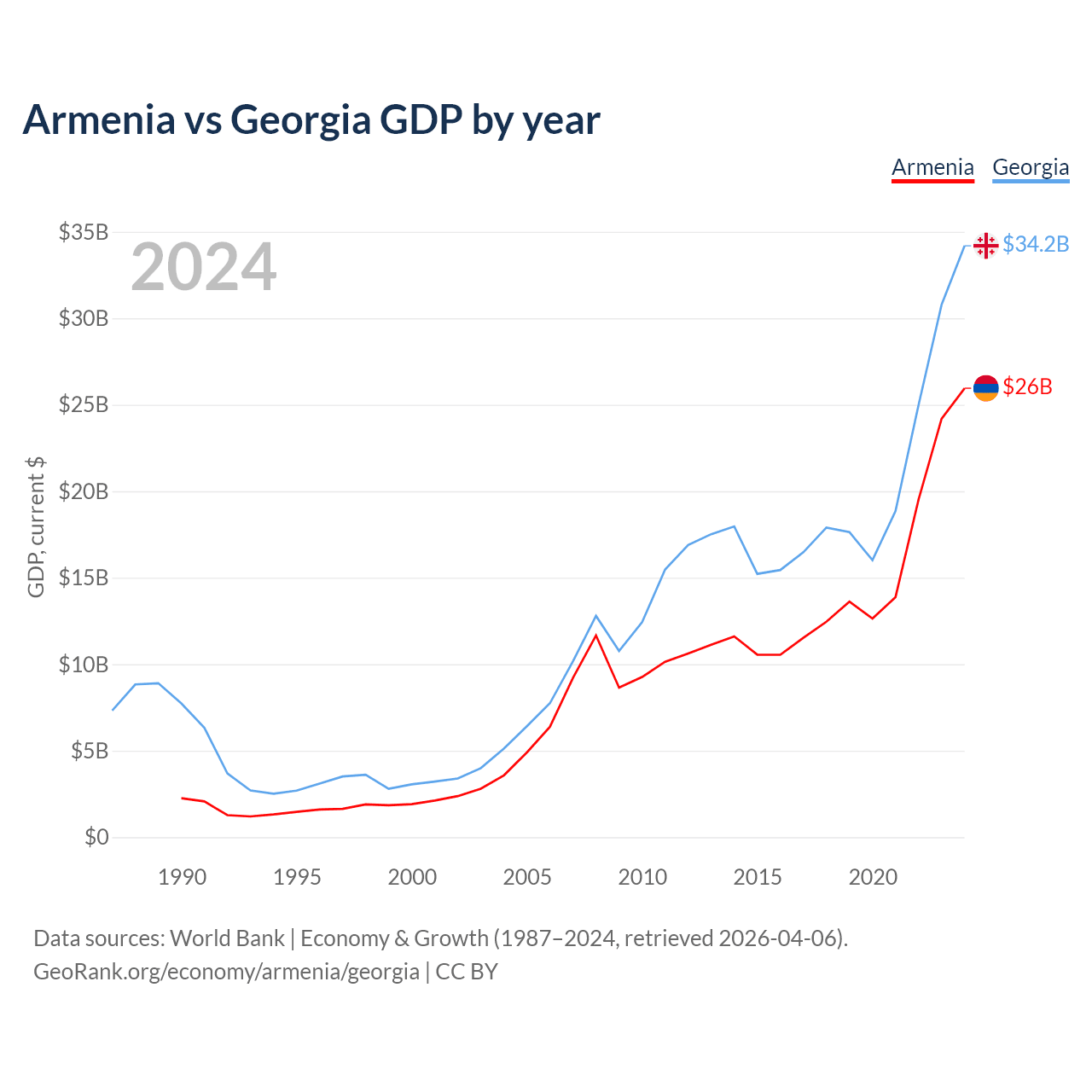 Armenia has a GDP of $26B compared to $34.2B for Georgia, ranking 114/197 and 107/197 by economy size, respectively.