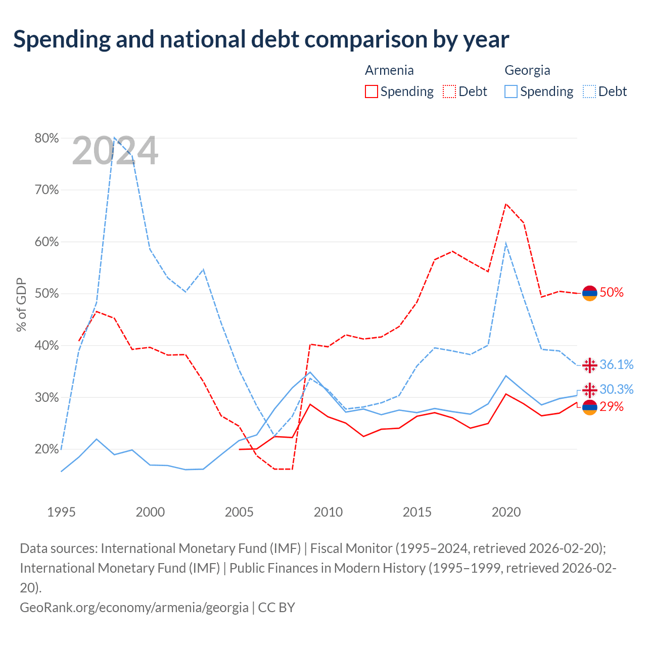 Armenia has $13B in government debt (50% of GDP), compared to $12.3B (36.1% of GDP) in Georgia.