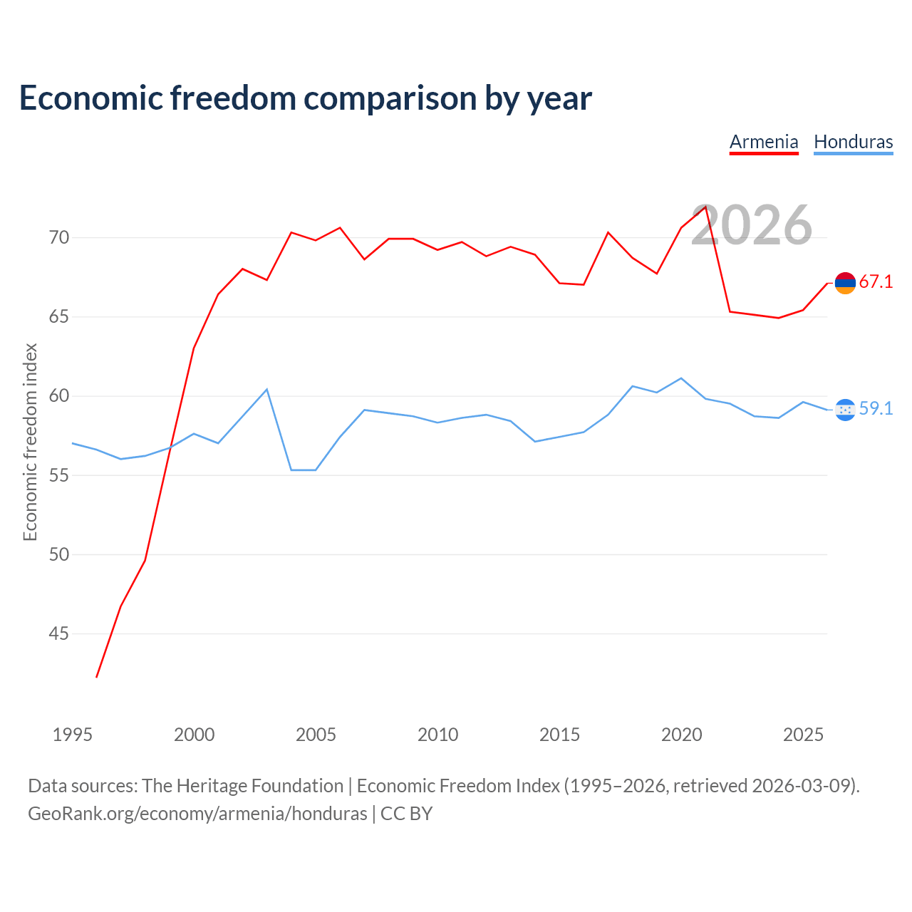 The Economic Freedom Index for Armenia is 67.1, ranking 58/197, compared to 59.1 for Honduras, ranking 105/197. The chart above displays a comparison of annual changes in economic freedom indexes.