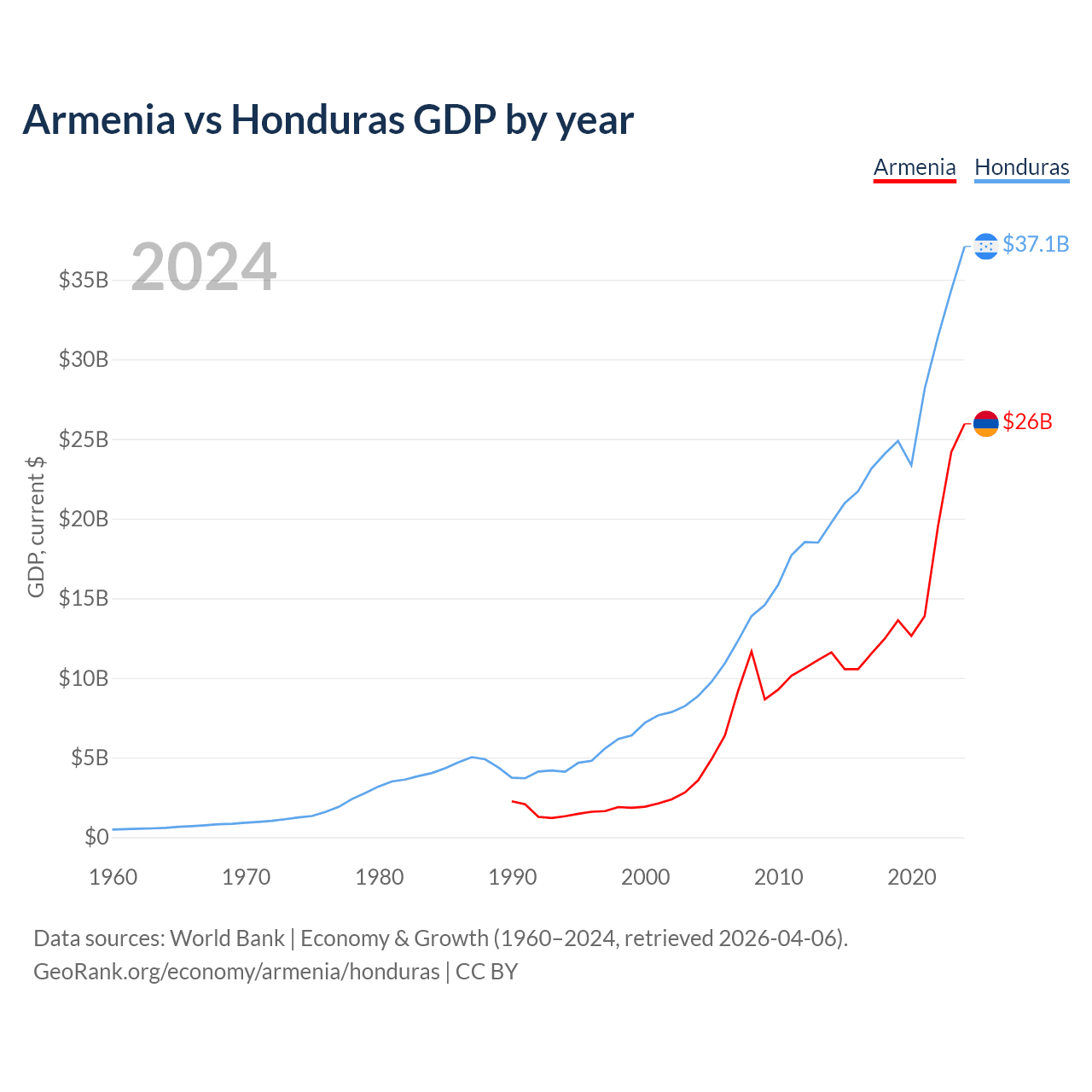Armenia has a GDP of $26B compared to $37.1B for Honduras, ranking 114/197 and 104/197 by economy size, respectively.