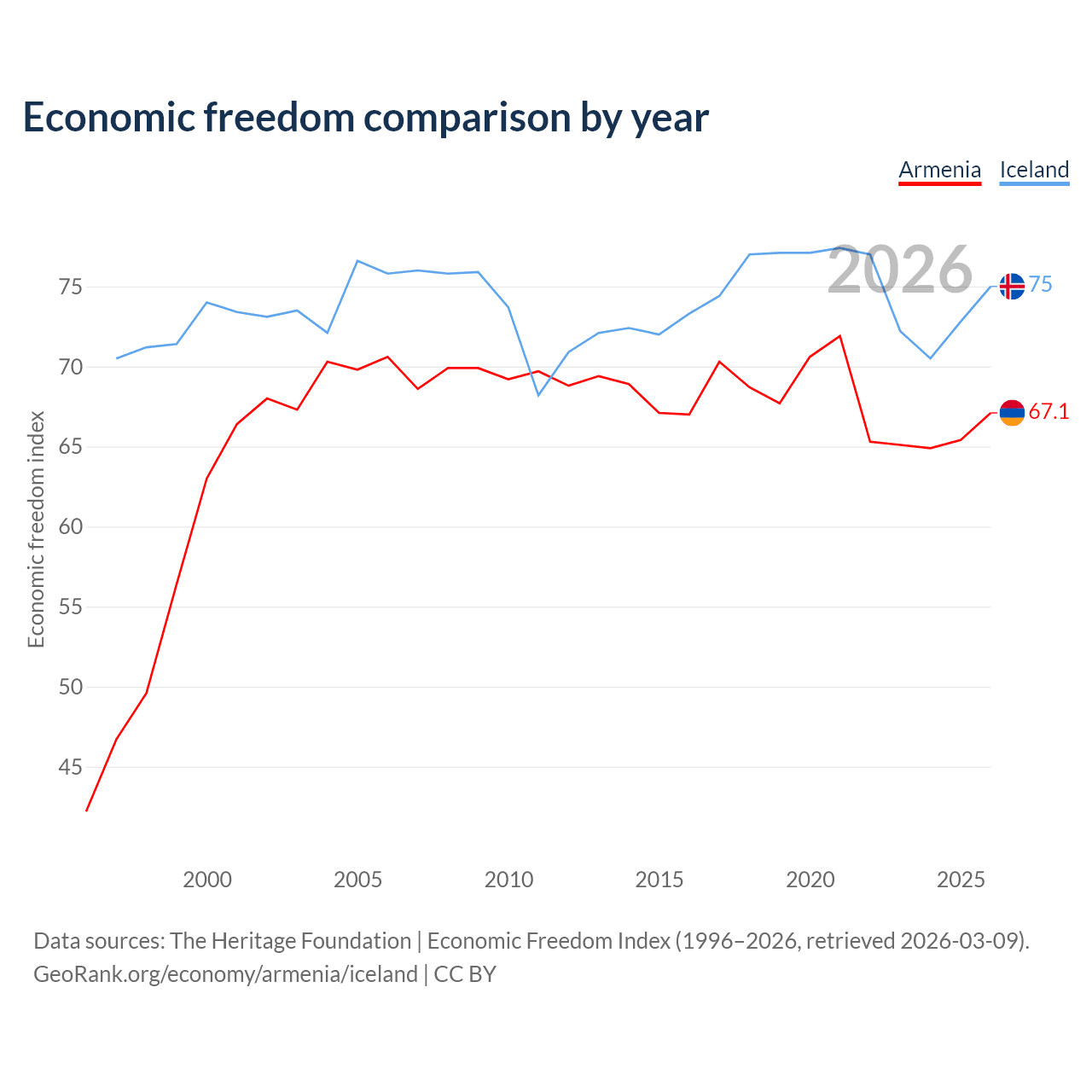 The Economic Freedom Index for Armenia is 67.1, ranking 58/197, compared to 75 for Iceland, ranking 19/197. The chart above displays a comparison of annual changes in economic freedom indexes.