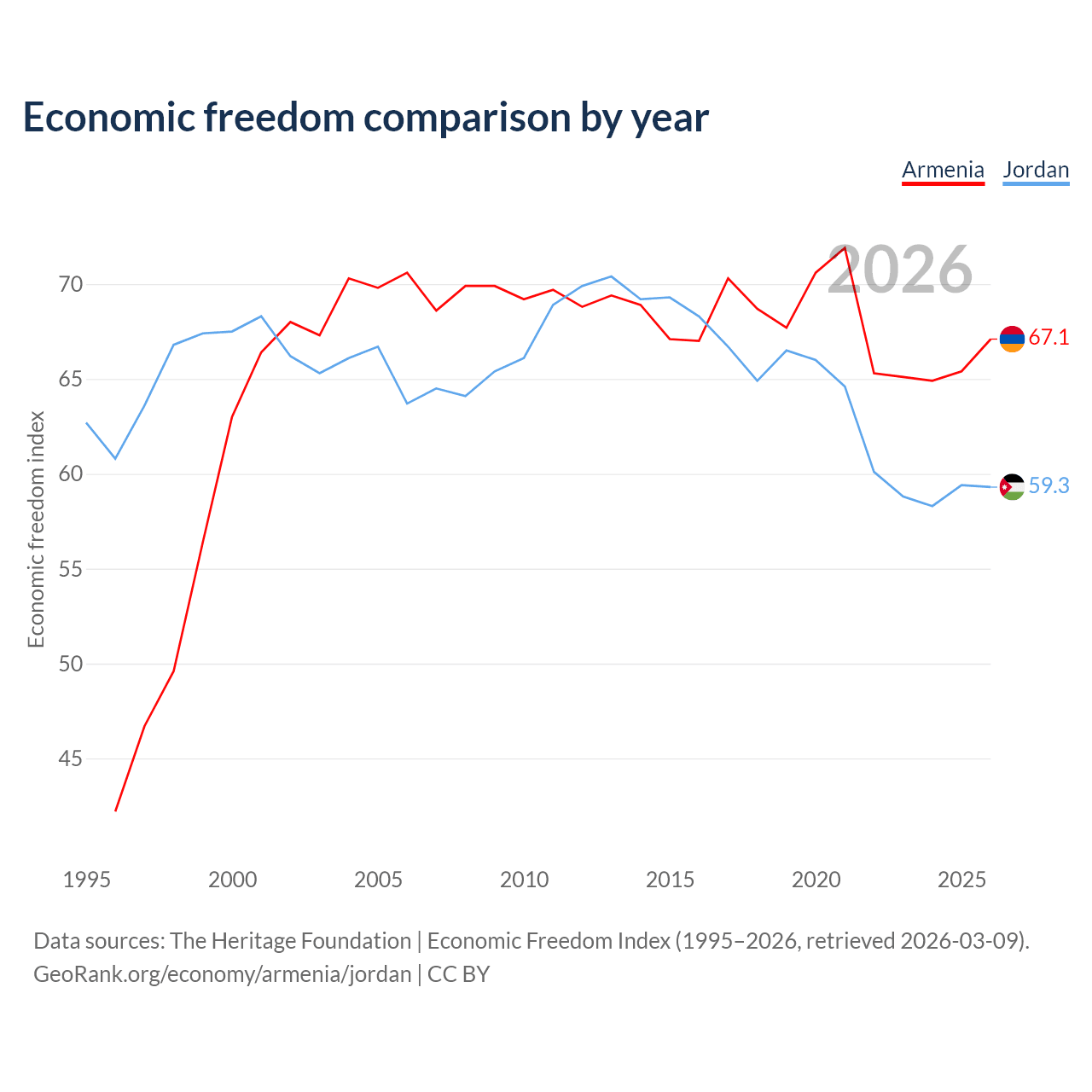 The Economic Freedom Index for Armenia is 67.1, ranking 58/197, compared to 59.3 for Jordan, ranking 104/197. The chart above displays a comparison of annual changes in economic freedom indexes.
