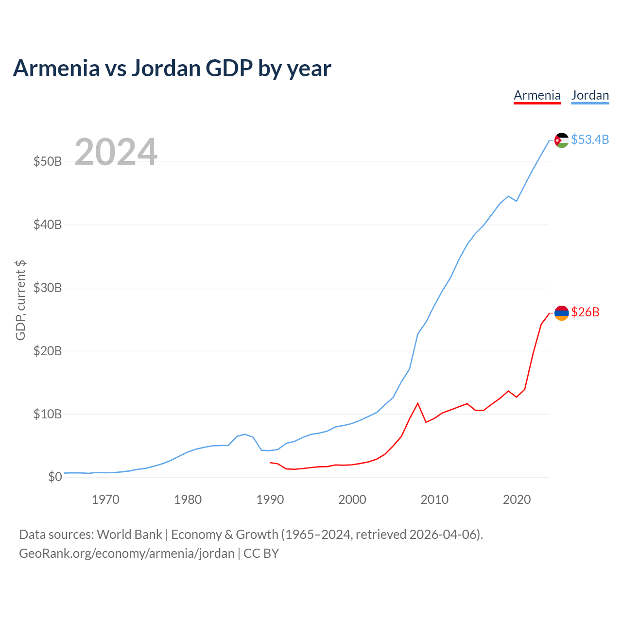 Armenia has a GDP of $26B compared to $53.4B for Jordan, ranking 114/197 and 90/197 by economy size, respectively.