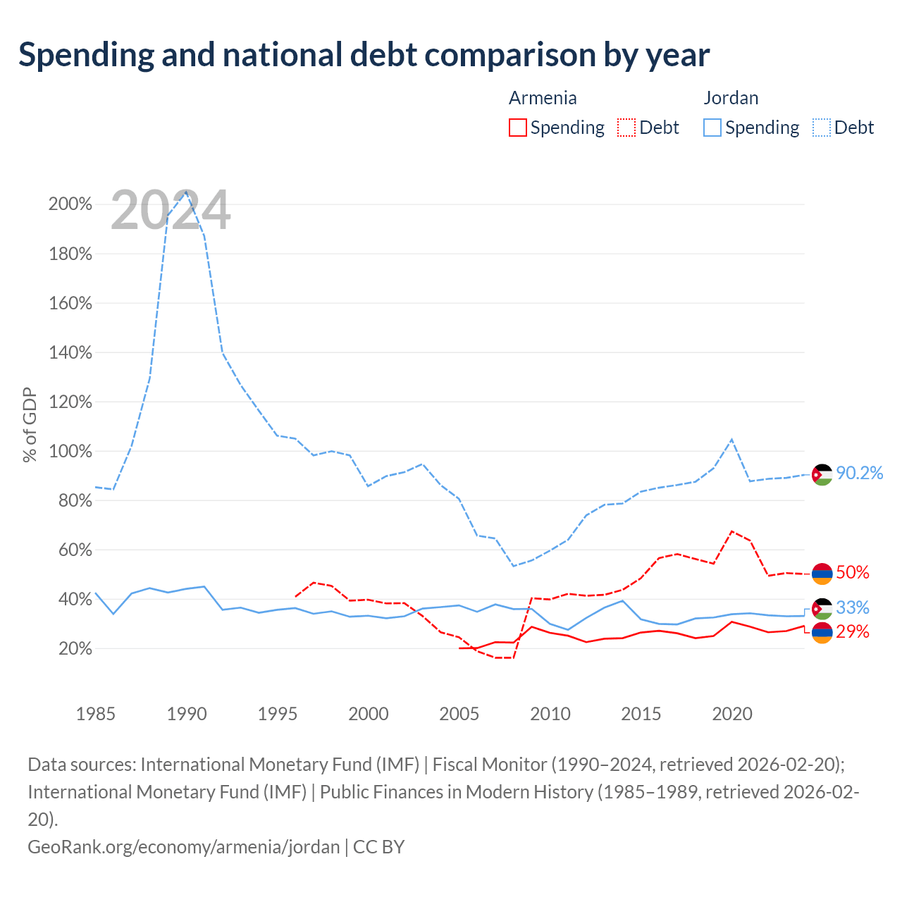 Armenia has $13B in government debt (50% of GDP), compared to $48.1B (90.2% of GDP) in Jordan.