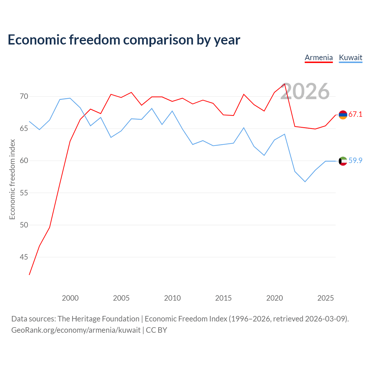 The Economic Freedom Index for Armenia is 67.1, ranking 58/197, compared to 59.9 for Kuwait, ranking 100/197. The chart above displays a comparison of annual changes in economic freedom indexes.
