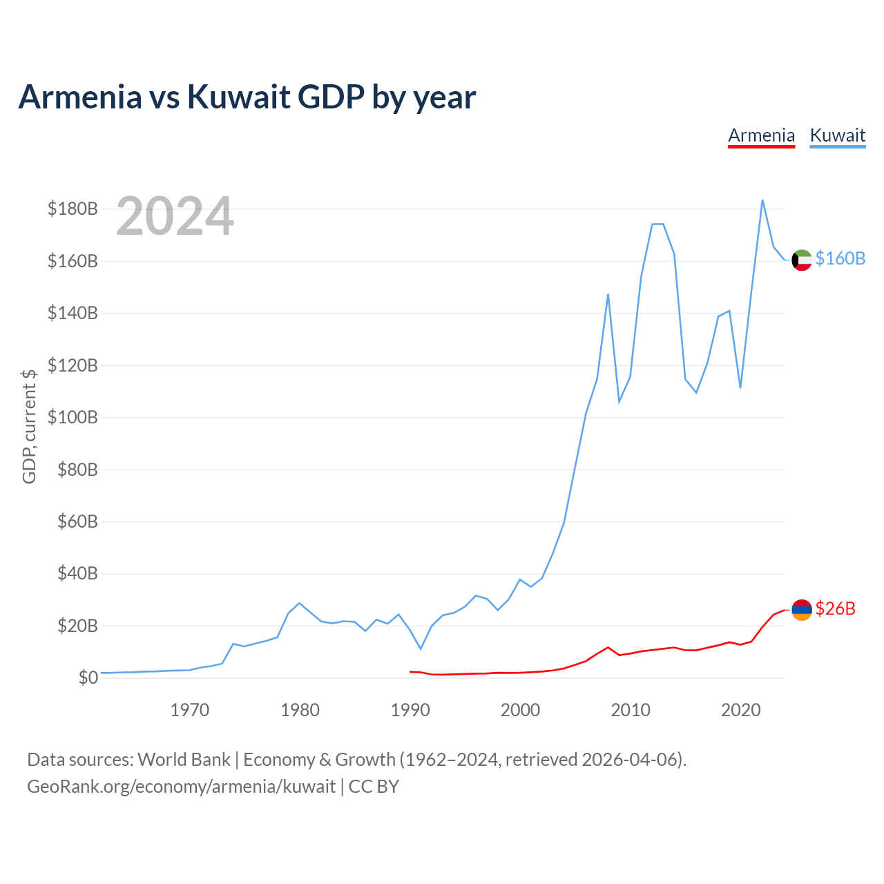 Armenia has a GDP of $26B compared to $160B for Kuwait, ranking 114/197 and 59/197 by economy size, respectively.