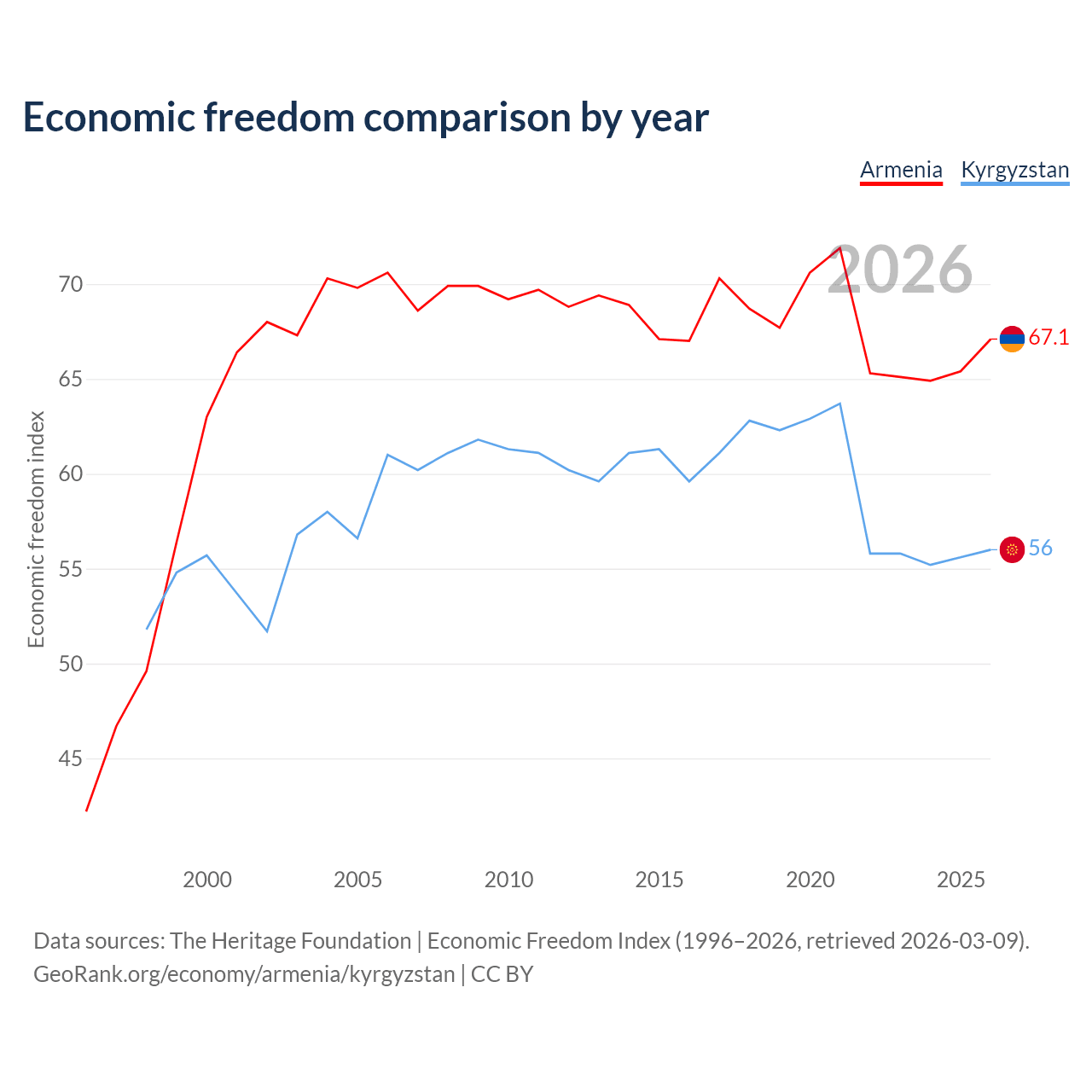 The Economic Freedom Index for Armenia is 67.1, ranking 58/197, compared to 56 for Kyrgyzstan, ranking 126/197. The chart above displays a comparison of annual changes in economic freedom indexes.