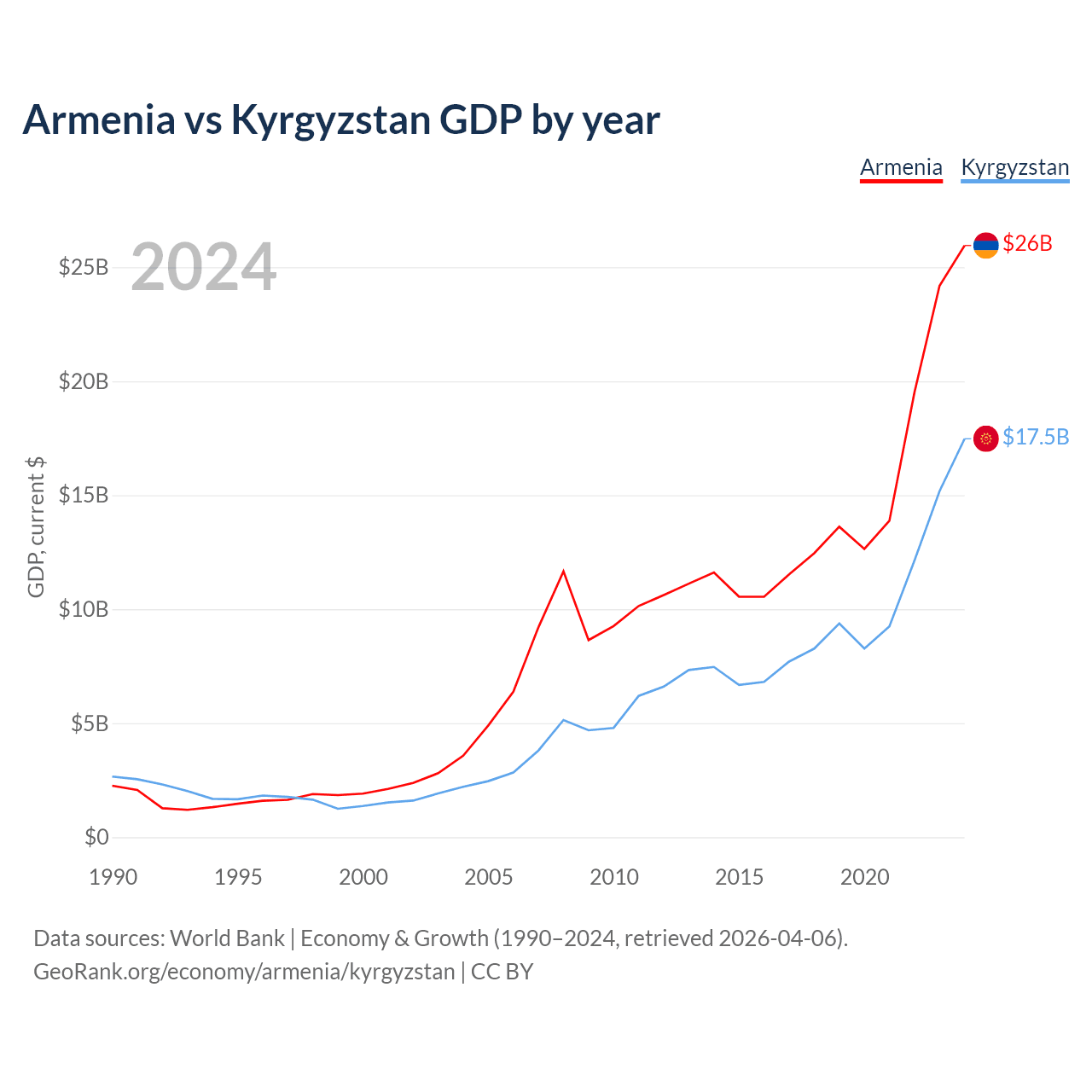 Data sources: World Bank | Economy & Growth (1990–2024, retrieved 2026-04-06).