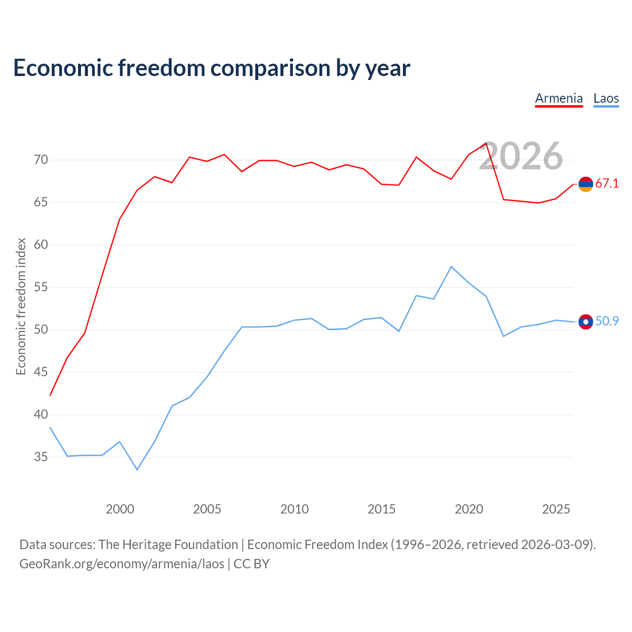 The Economic Freedom Index for Armenia is 67.1, ranking 58/197, compared to 50.9 for Laos, ranking 157/197. The chart above displays a comparison of annual changes in economic freedom indexes.