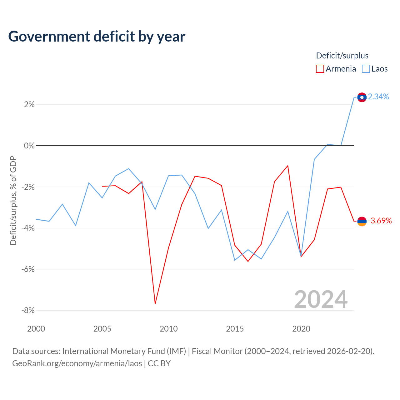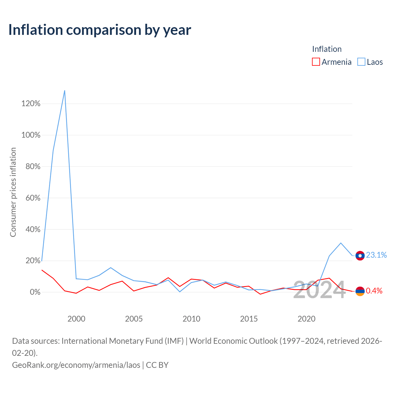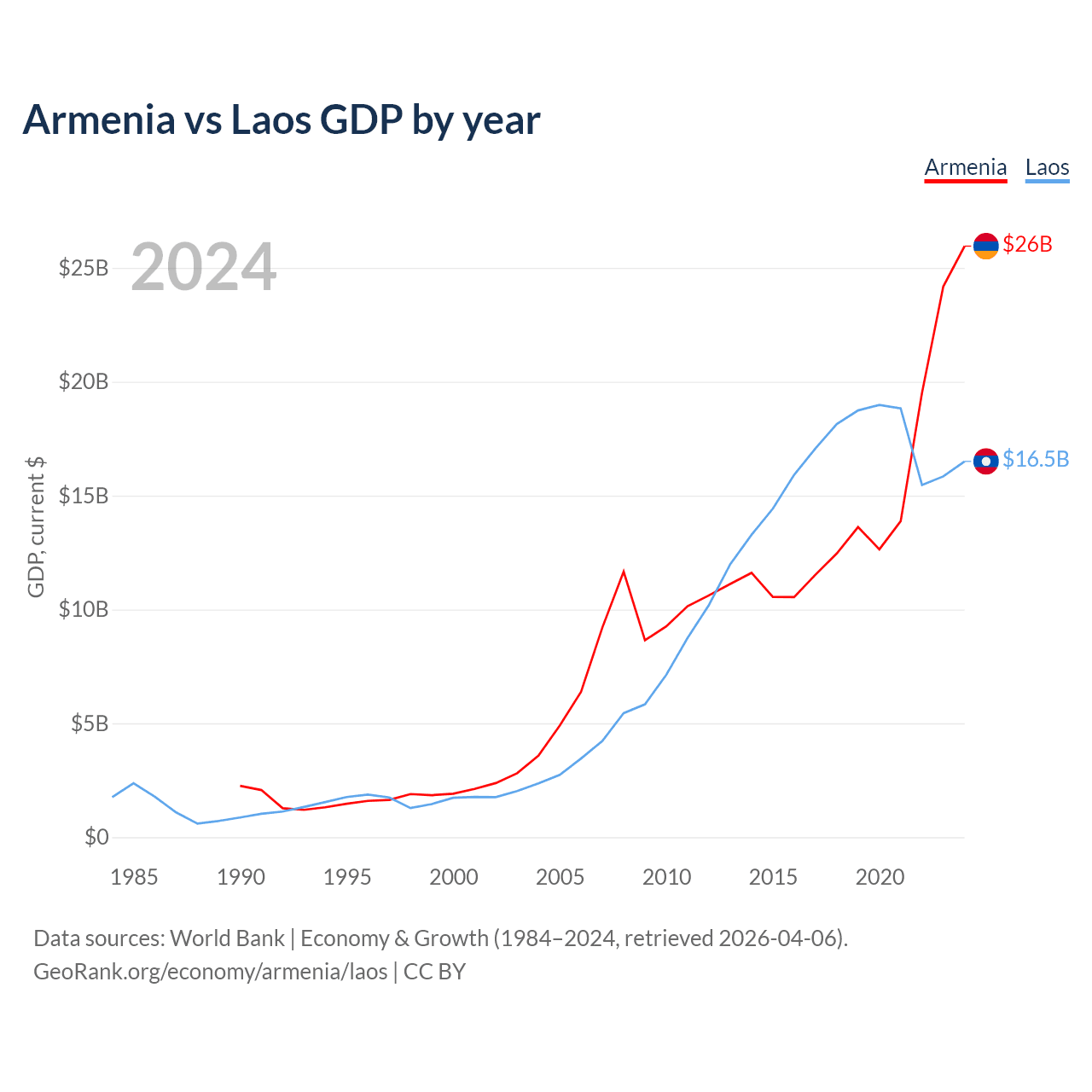Armenia has a GDP of $26B compared to $16.5B for Laos, ranking 114/197 and 139/197 by economy size, respectively.