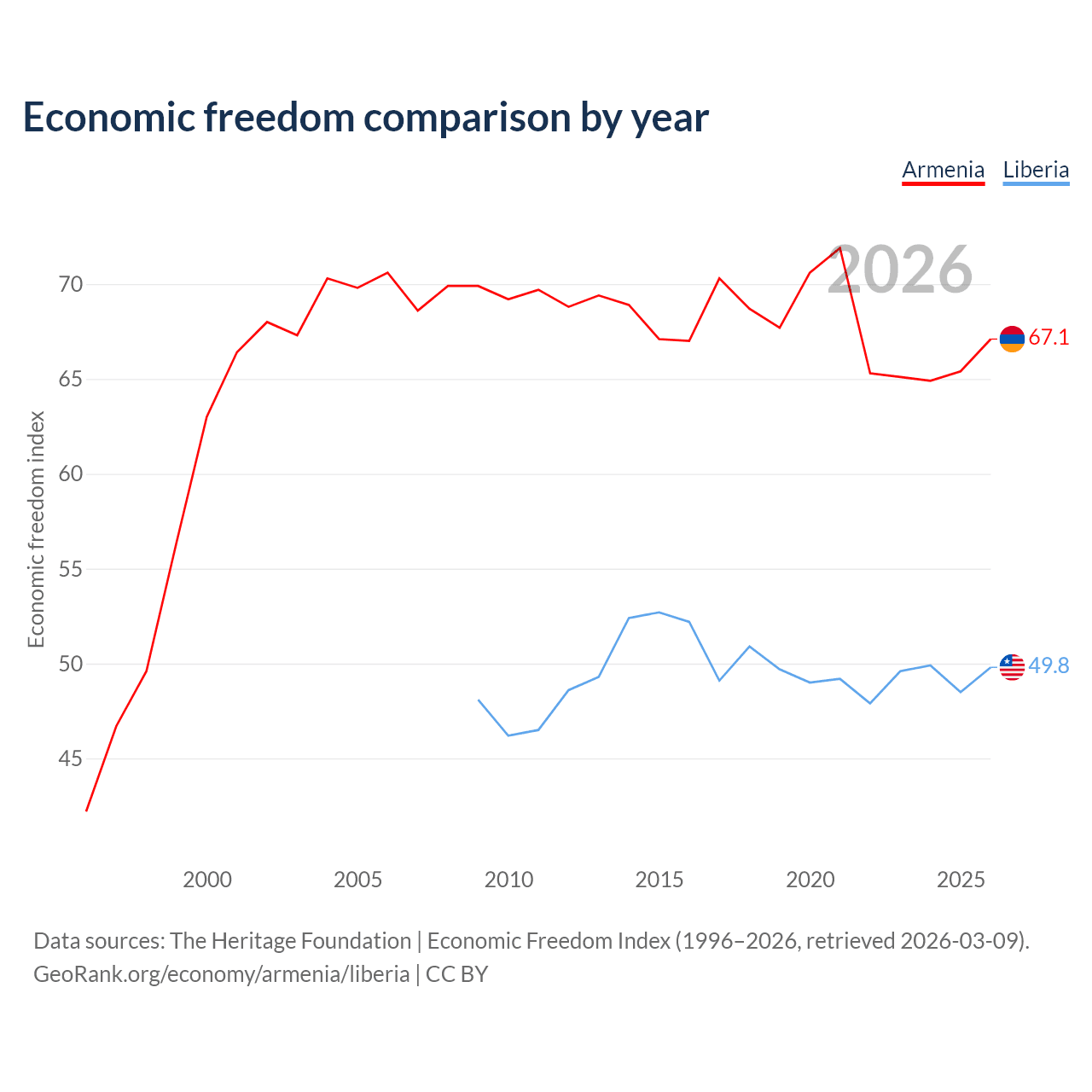 The Economic Freedom Index for Armenia is 67.1, ranking 58/197, compared to 49.8 for Liberia, ranking 163/197. The chart above displays a comparison of annual changes in economic freedom indexes.