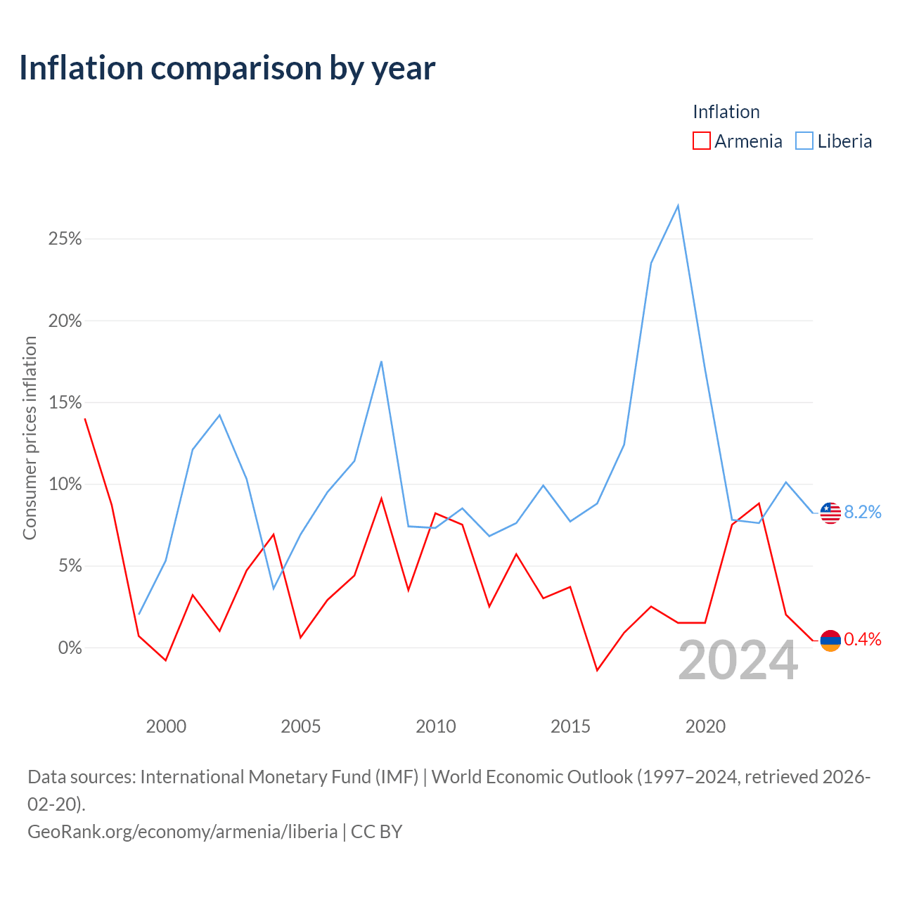 Armenia has a GDP of $26B compared to $4.78B for Liberia, ranking 114/197 and 163/197 by economy size, respectively.