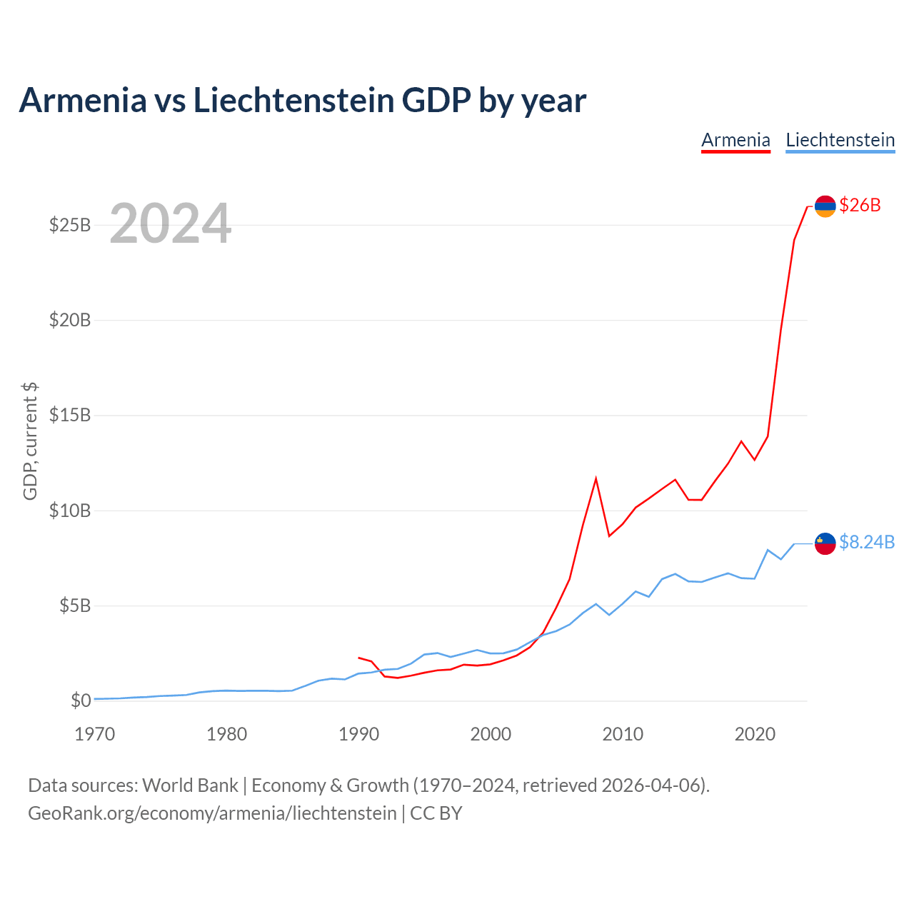 Armenia has a GDP of $26B compared to $8.24B for Liechtenstein, ranking 114/197 and 156/197 by economy size, respectively.