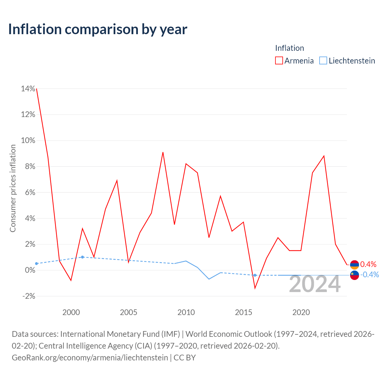 Over the past 24 years, Armenia has recorded an average annual inflation rate of 3.94%, compared with 0.04% in Liechtenstein. In 2020, inflation was 0.4% in Armenia and -0.4% in Liechtenstein.