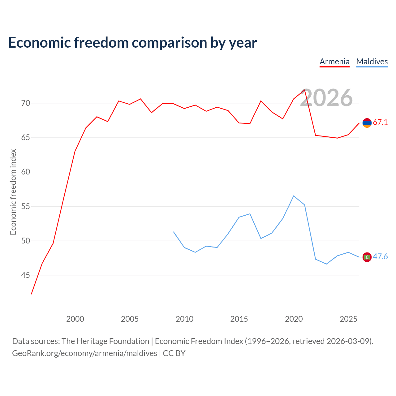 The Economic Freedom Index for Armenia is 67.1, ranking 58/197, compared to 47.6 for Maldives, ranking 174/197. The chart above displays a comparison of annual changes in economic freedom indexes.