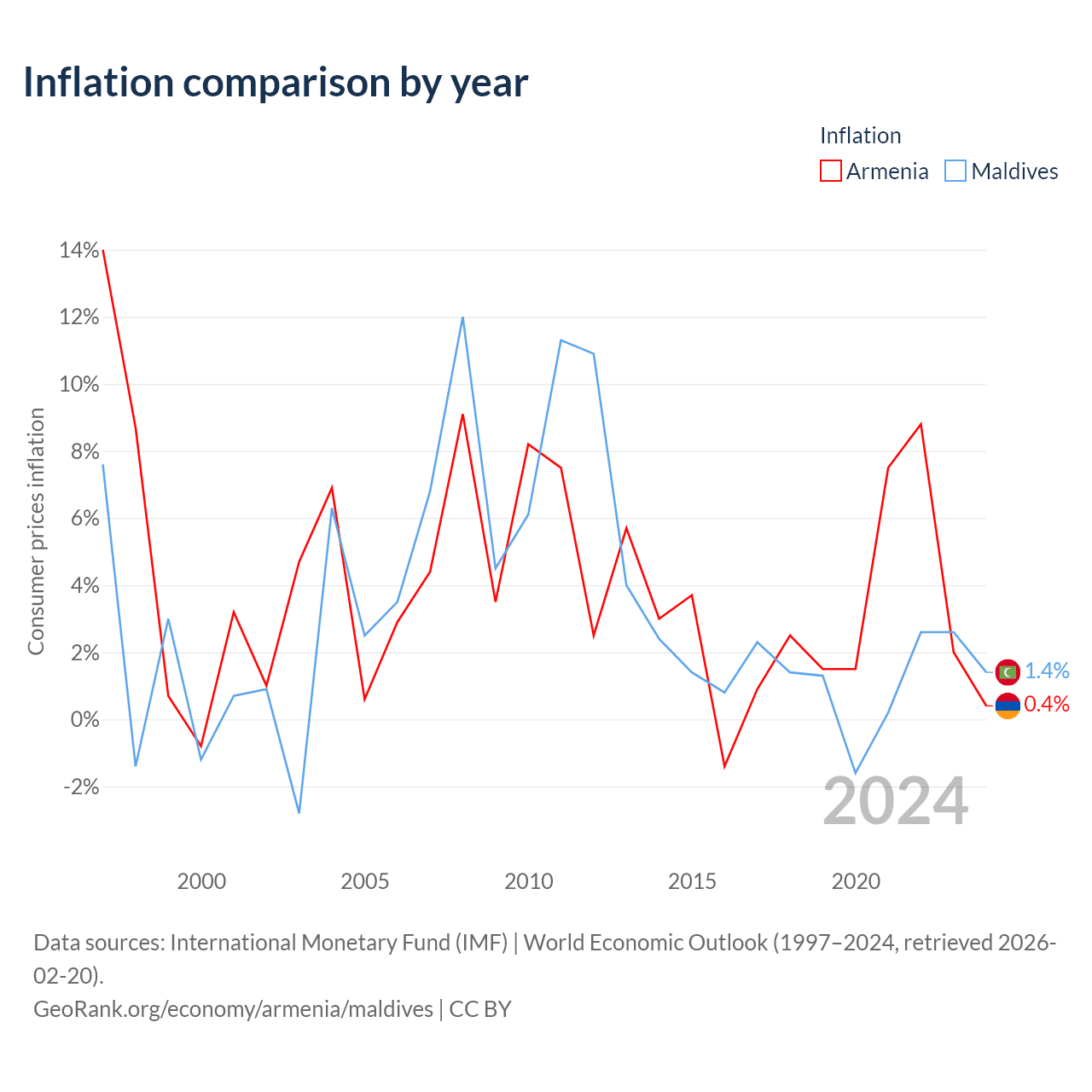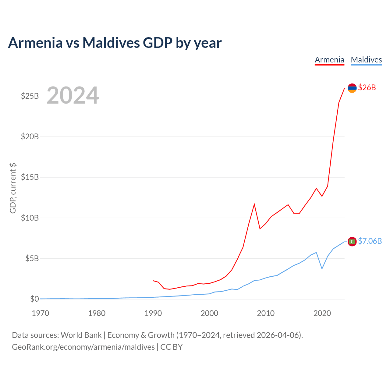 Armenia has a GDP of $26B compared to $7.06B for Maldives, ranking 114/197 and 159/197 by economy size, respectively.