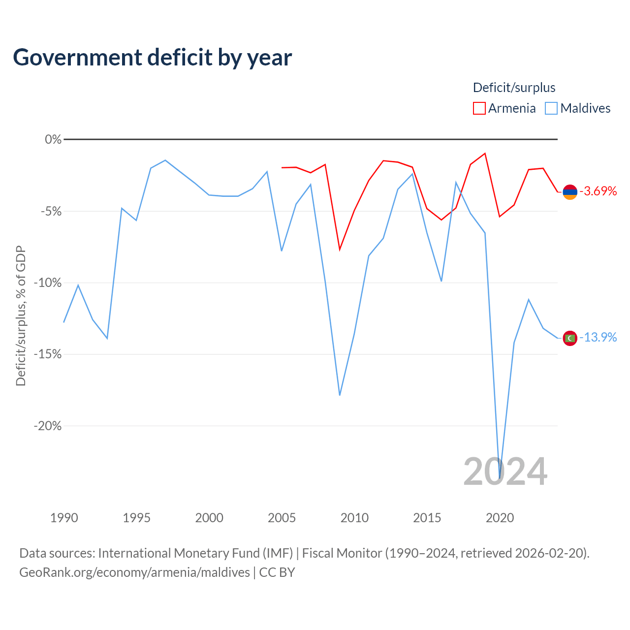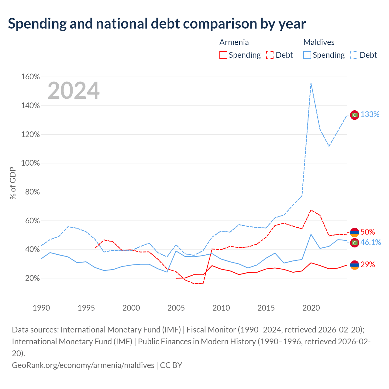 Armenia has $13B in government debt (50% of GDP), compared to $9.41B (133.3% of GDP) in Maldives.