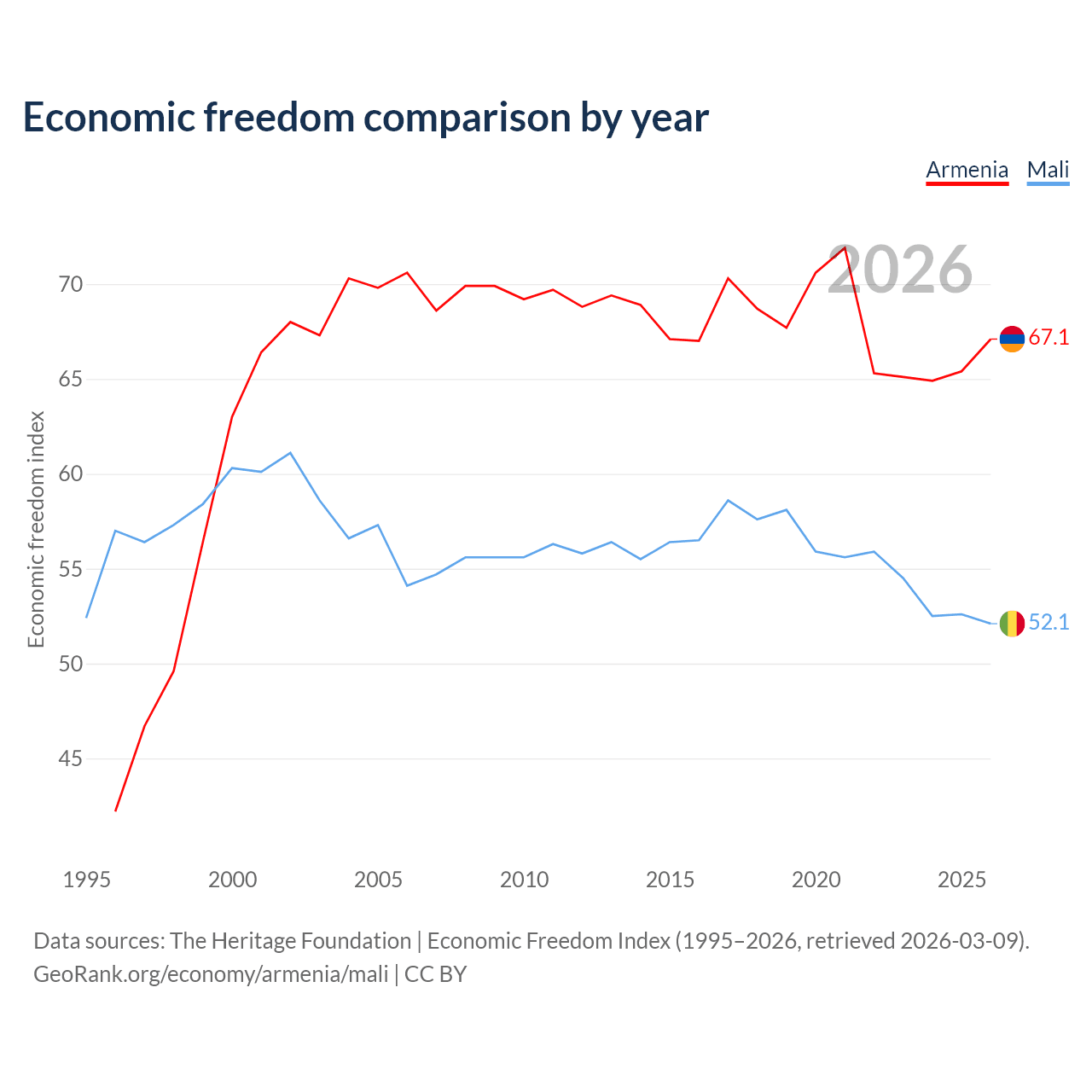 The Economic Freedom Index for Armenia is 67.1, ranking 58/197, compared to 52.1 for Mali, ranking 150/197. The chart above displays a comparison of annual changes in economic freedom indexes.