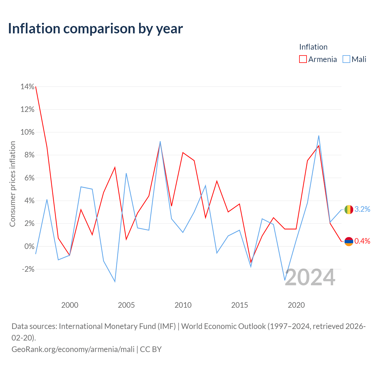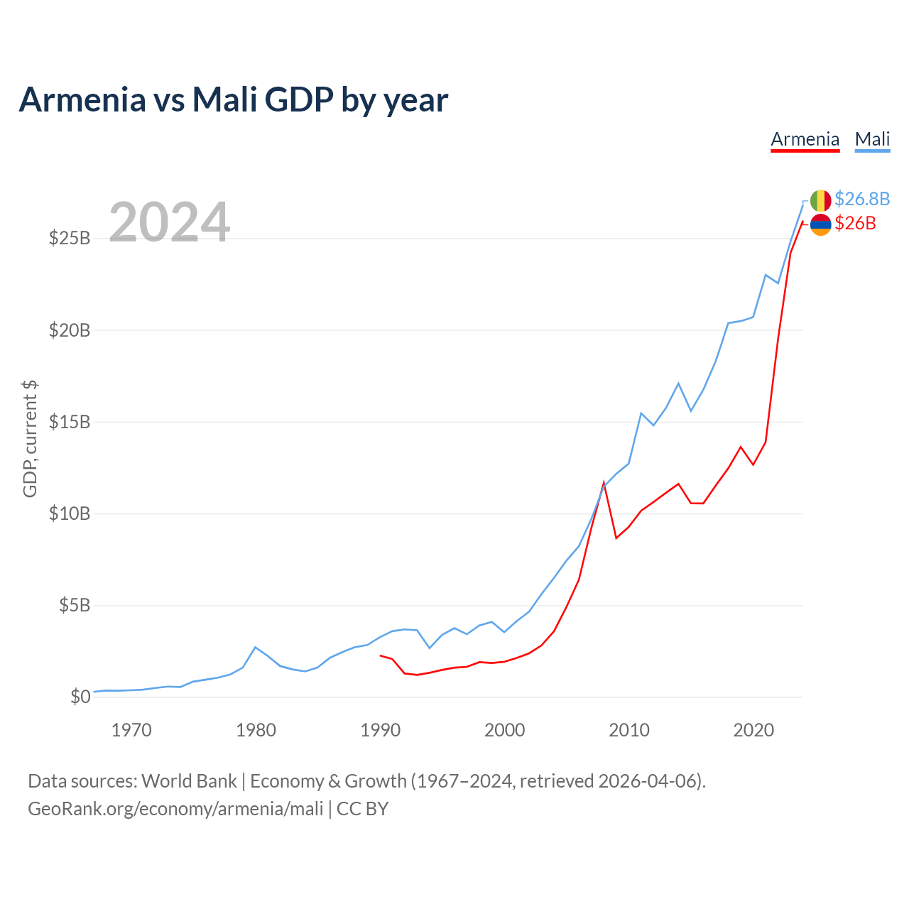 Armenia has a GDP of $26B compared to $26.8B for Mali, ranking 114/197 and 113/197 by economy size, respectively.