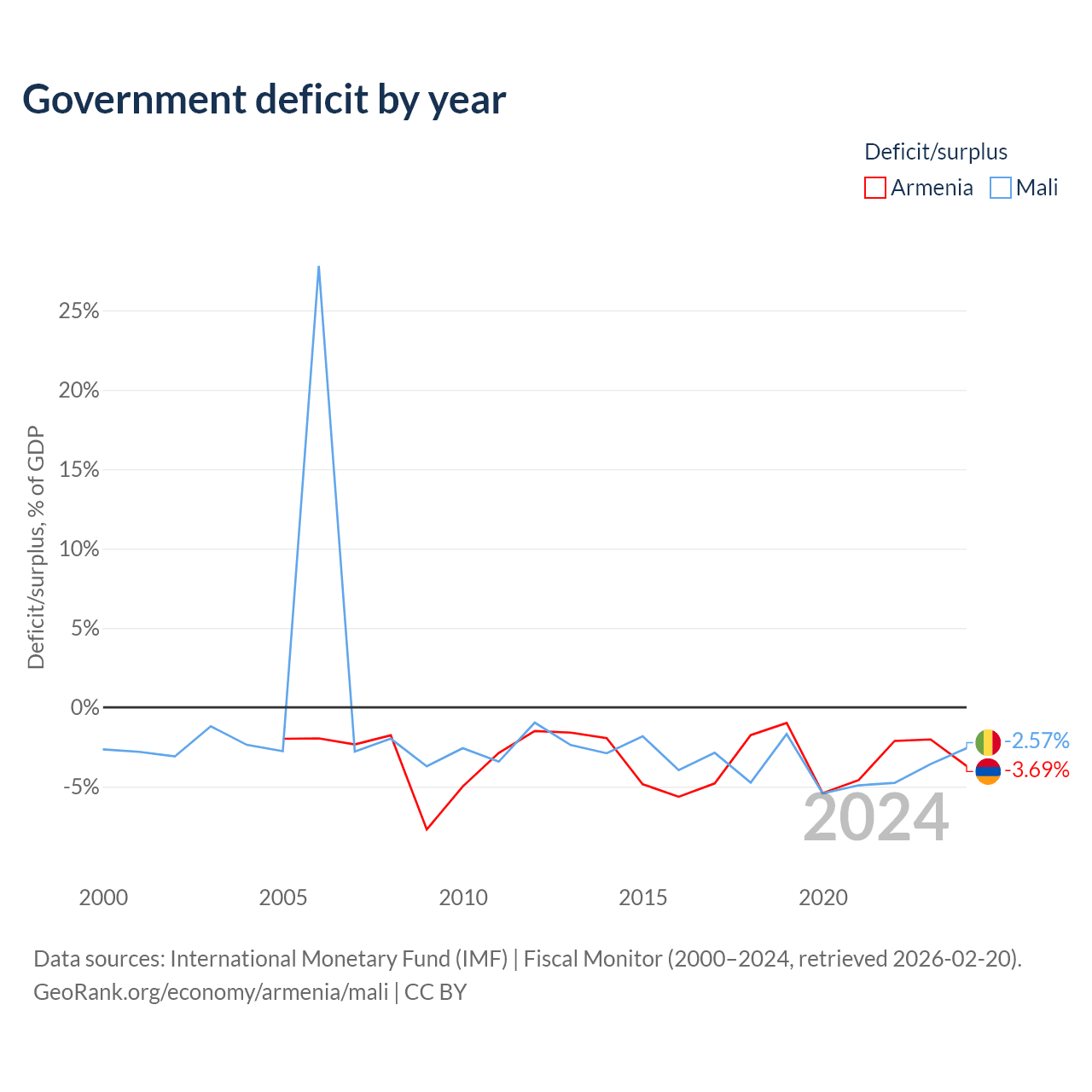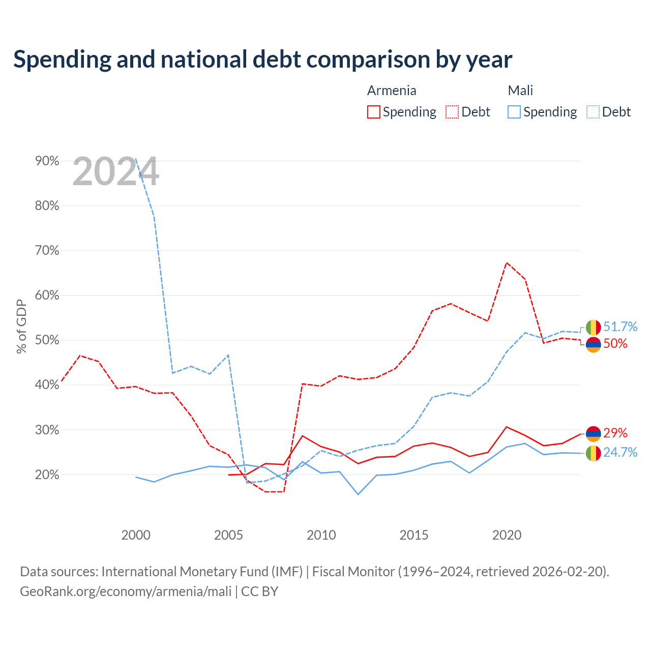 Armenia has $13B in government debt (50% of GDP), compared to $13.9B (51.7% of GDP) in Mali.