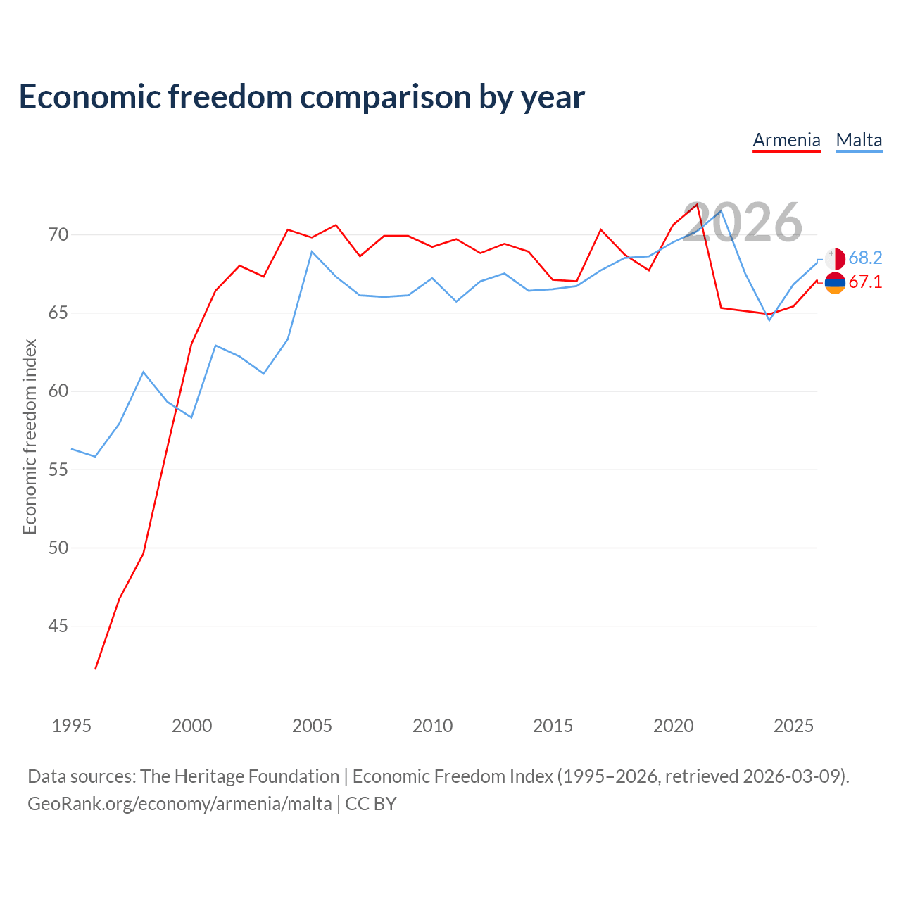 The Economic Freedom Index for Armenia is 67.1, ranking 58/197, compared to 68.2 for Malta, ranking 49/197. The chart above displays a comparison of annual changes in economic freedom indexes.