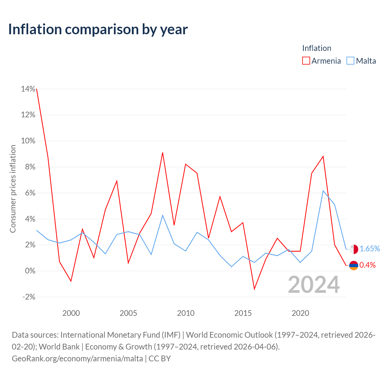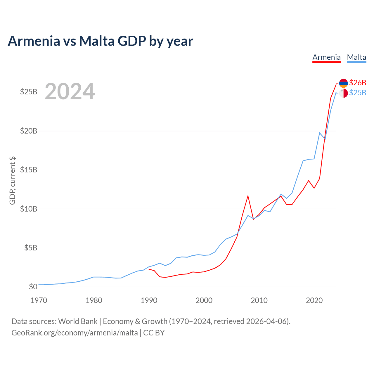 Armenia has a GDP of $26B compared to $25B for Malta, ranking 114/197 and 119/197 by economy size, respectively.