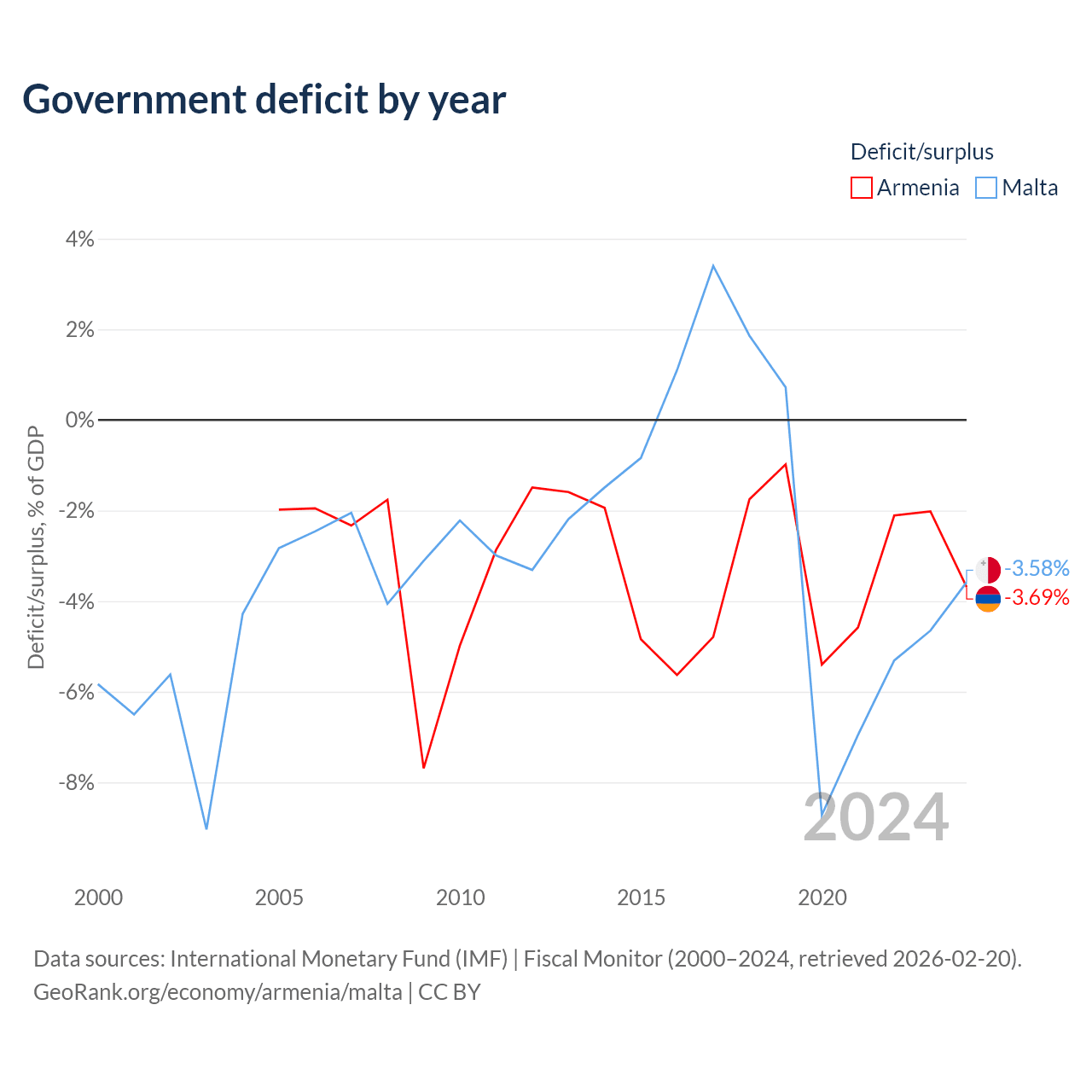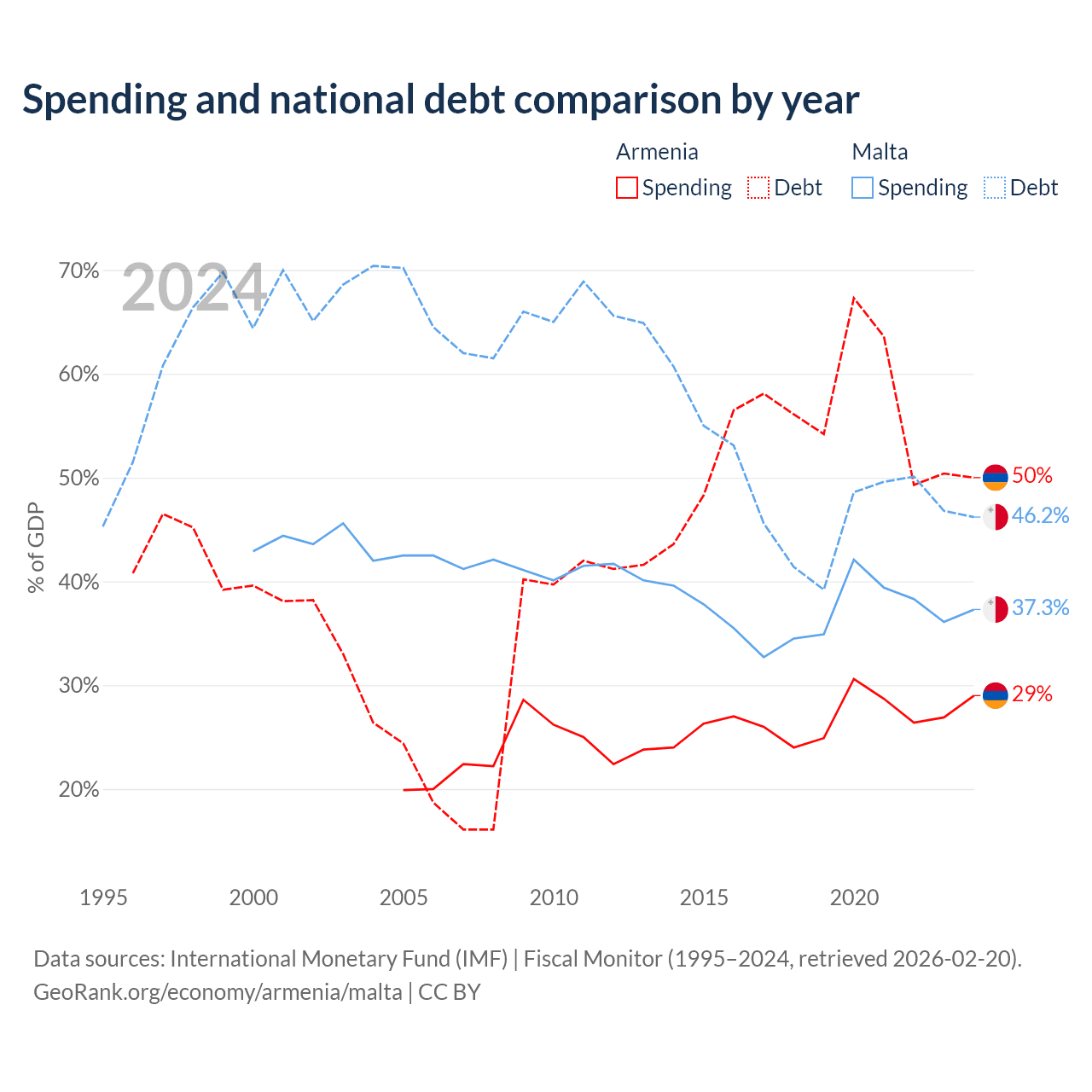 Armenia has $13B in government debt (50% of GDP), compared to $11.5B (46.2% of GDP) in Malta.