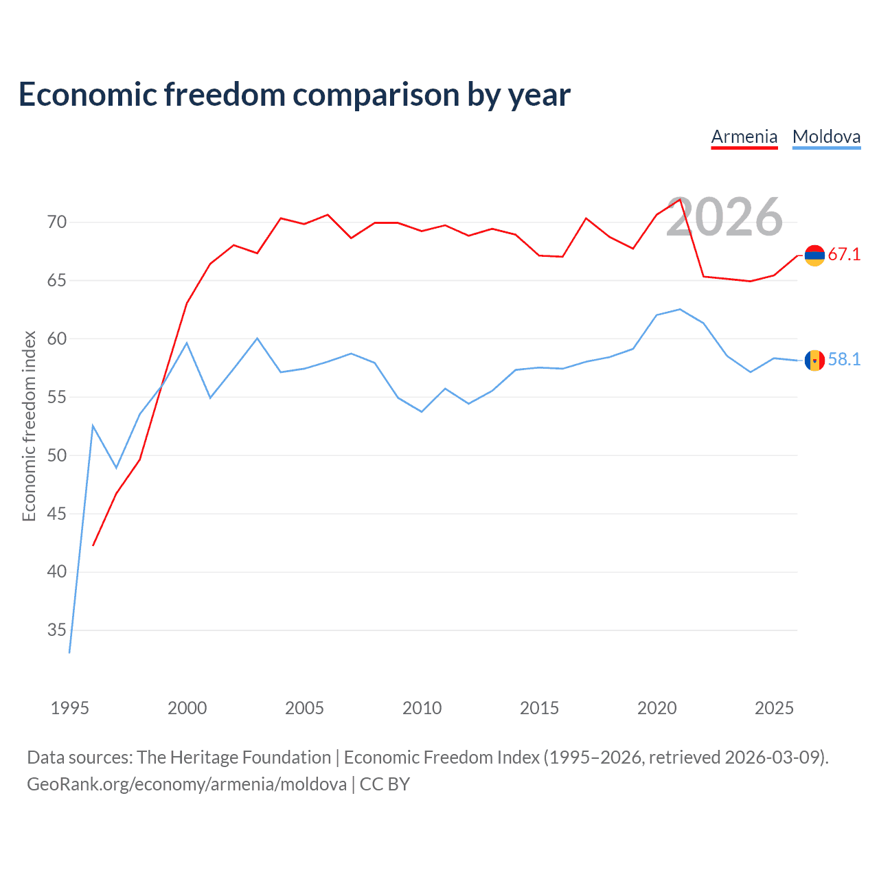 The Economic Freedom Index for Armenia is 67.1, ranking 58/197, compared to 58.1 for Moldova, ranking 112/197. The chart above displays a comparison of annual changes in economic freedom indexes.