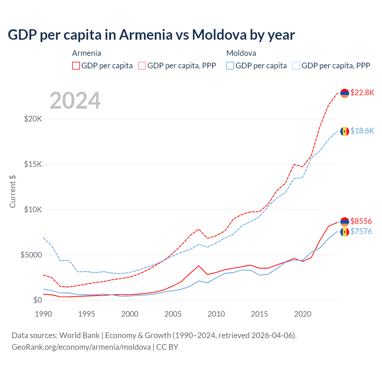 GDP per capita in Armenia vs Moldova by year