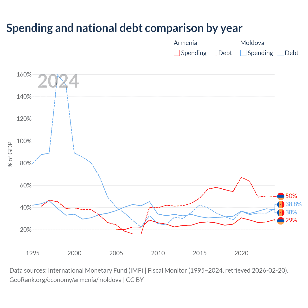 Armenia has $13B in government debt (50% of GDP), compared to $7.06B (38.8% of GDP) in Moldova.