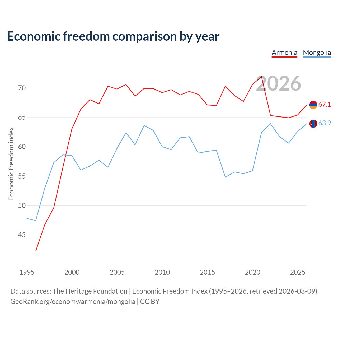 The Economic Freedom Index for Armenia is 67.1, ranking 58/197, compared to 63.9 for Mongolia, ranking 76/197. The chart above displays a comparison of annual changes in economic freedom indexes.