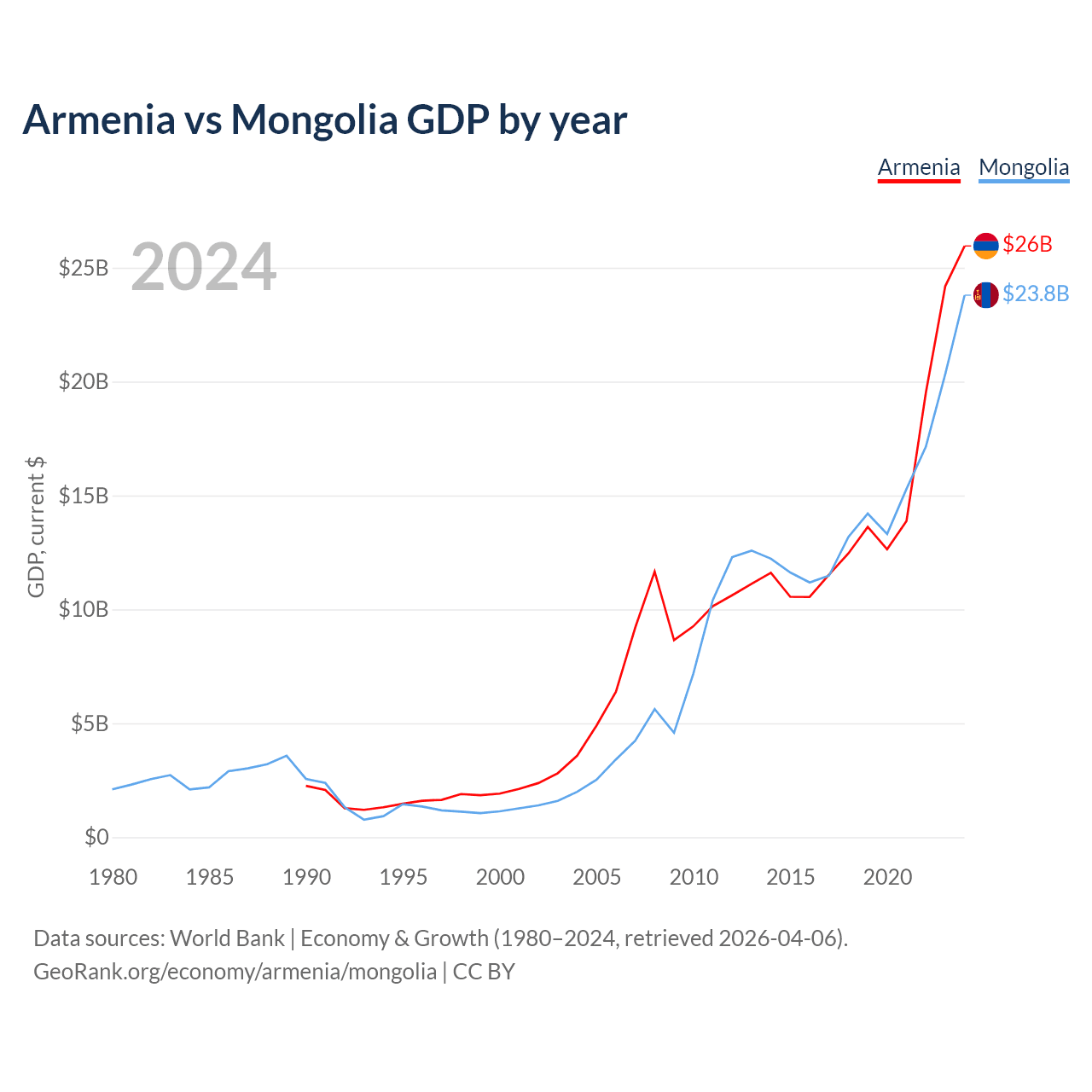 Armenia has a GDP of $26B compared to $23.8B for Mongolia, ranking 114/197 and 121/197 by economy size, respectively.