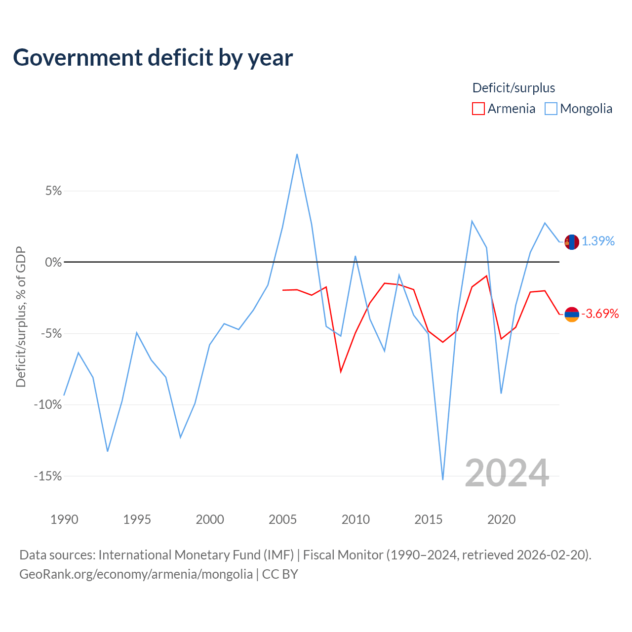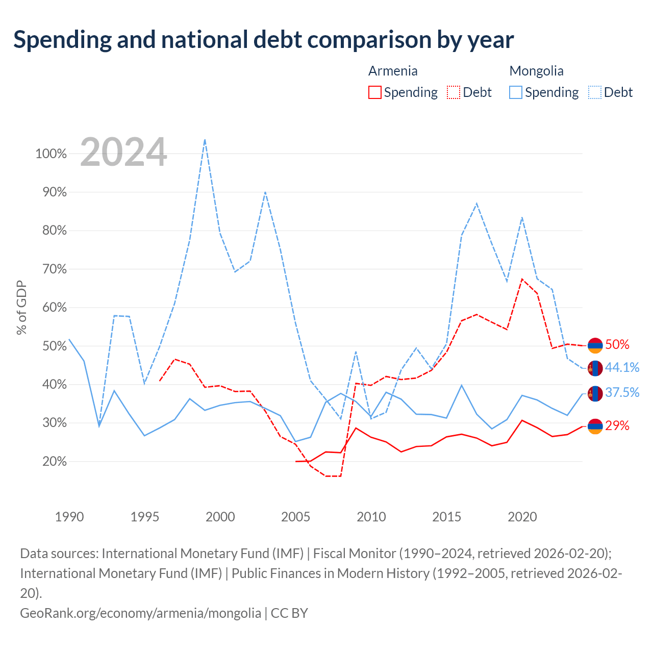 Armenia has $13B in government debt (50% of GDP), compared to $10.5B (44.1% of GDP) in Mongolia.