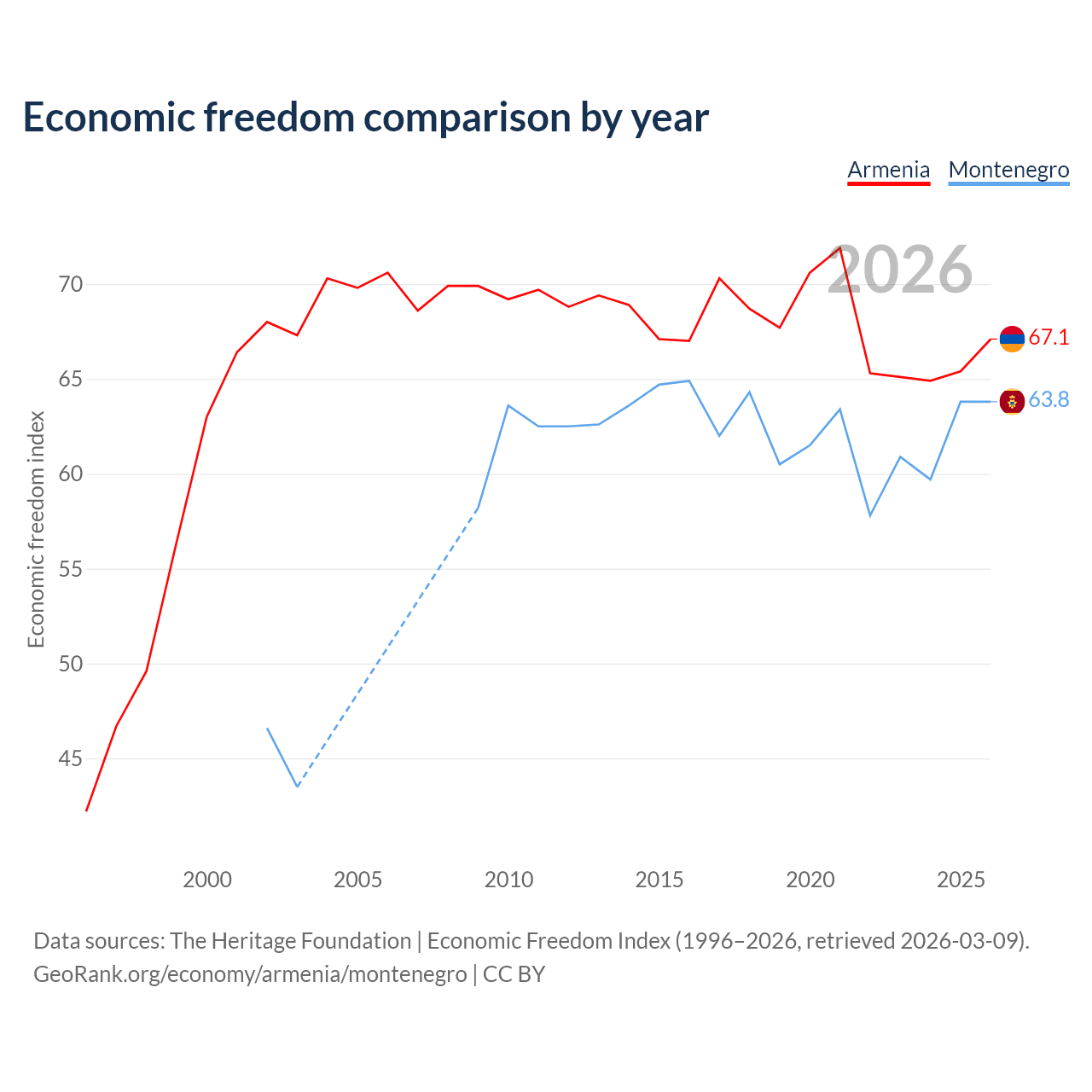 The Economic Freedom Index for Armenia is 67.1, ranking 58/197, compared to 63.8 for Montenegro, ranking 78/197. The chart above displays a comparison of annual changes in economic freedom indexes.