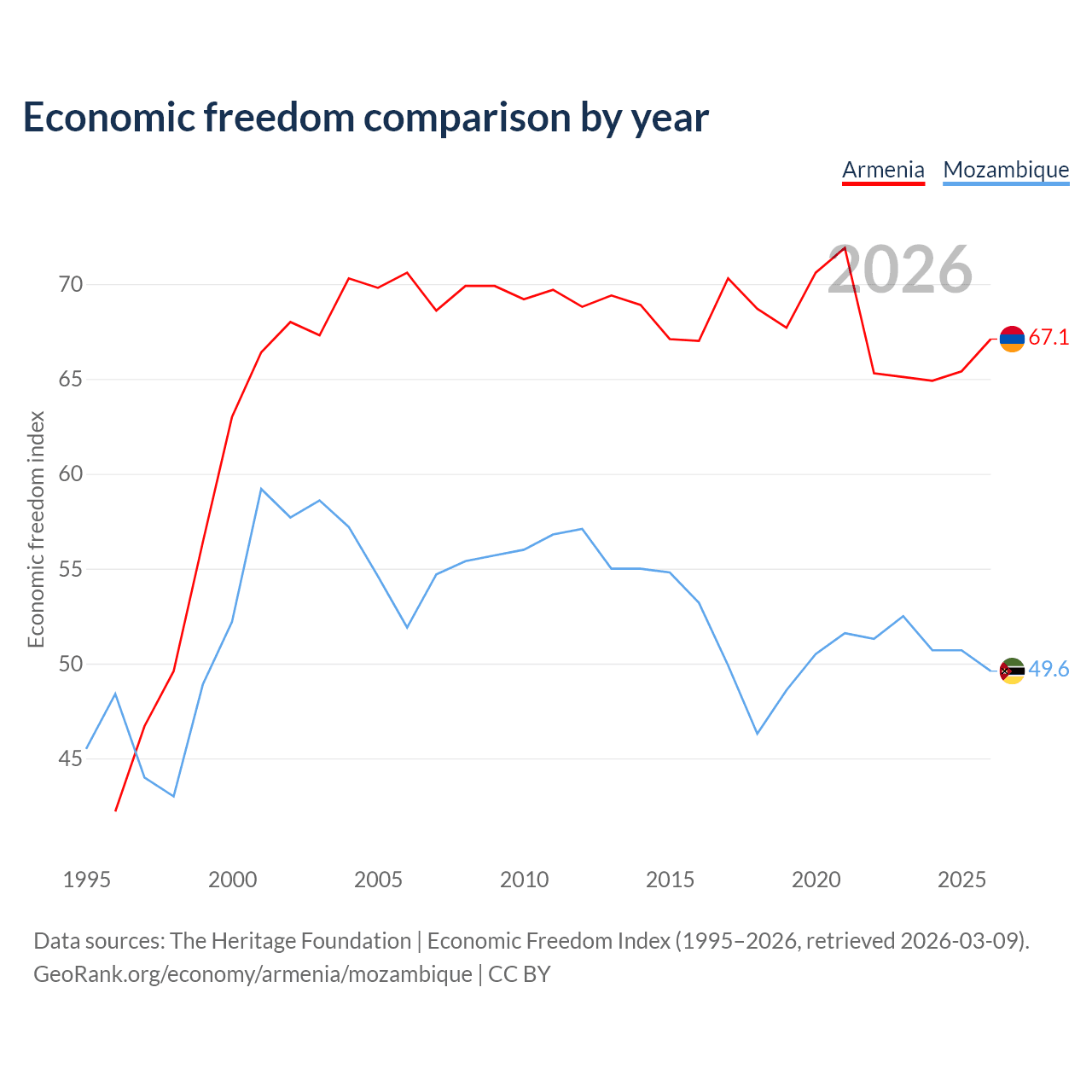 The Economic Freedom Index for Armenia is 67.1, ranking 58/197, compared to 49.6 for Mozambique, ranking 164/197. The chart above displays a comparison of annual changes in economic freedom indexes.