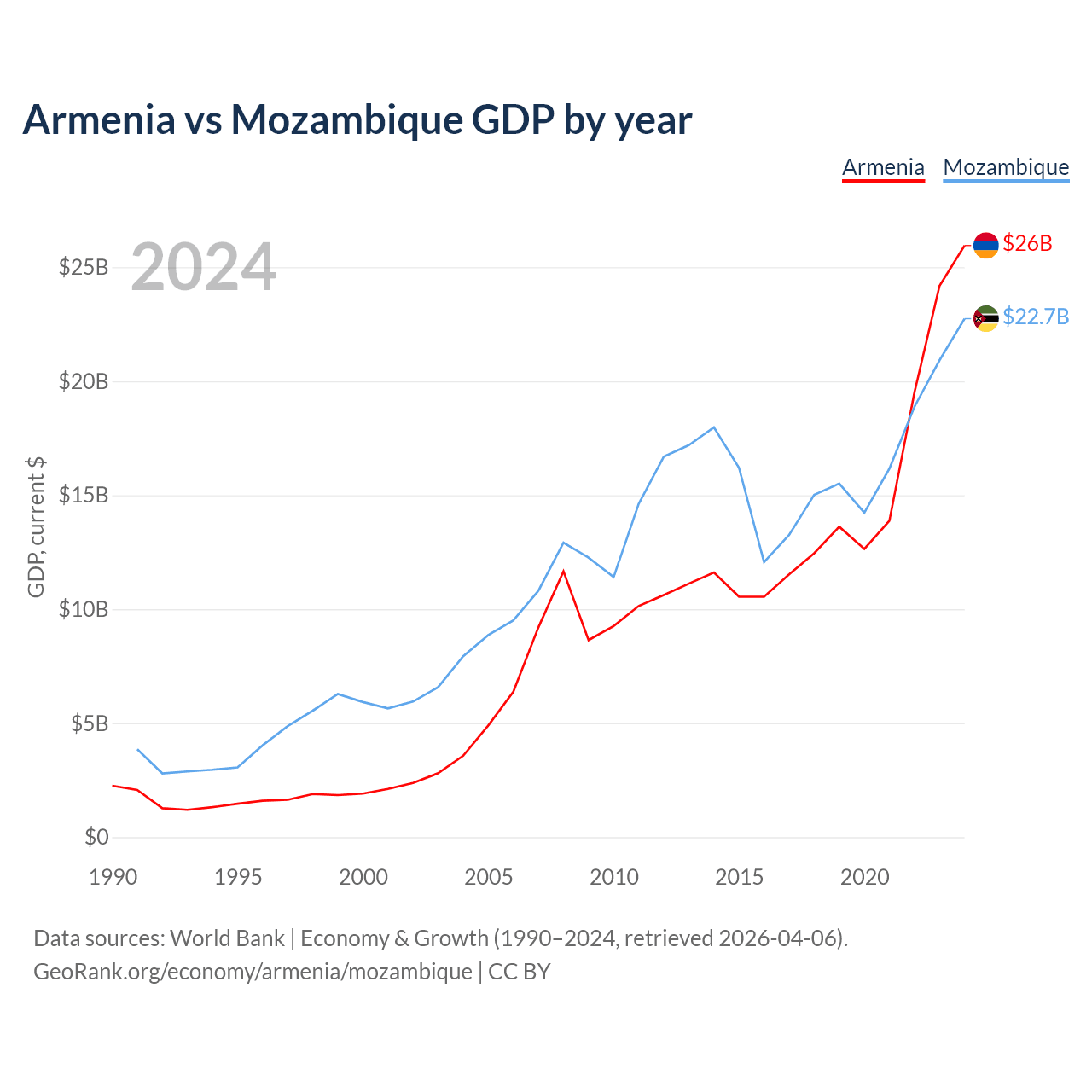 Armenia has a GDP of $26B compared to $22.7B for Mozambique, ranking 114/197 and 123/197 by economy size, respectively.