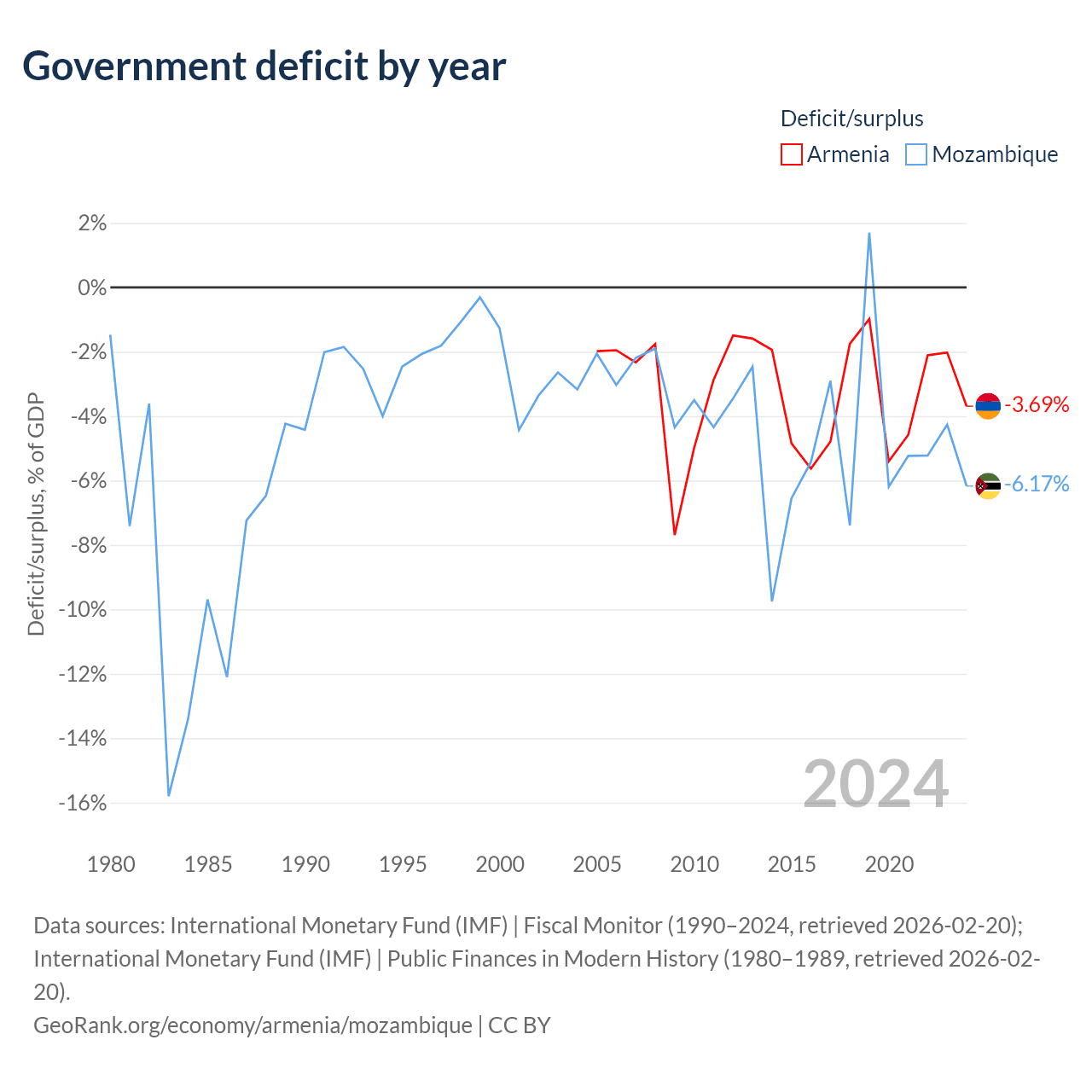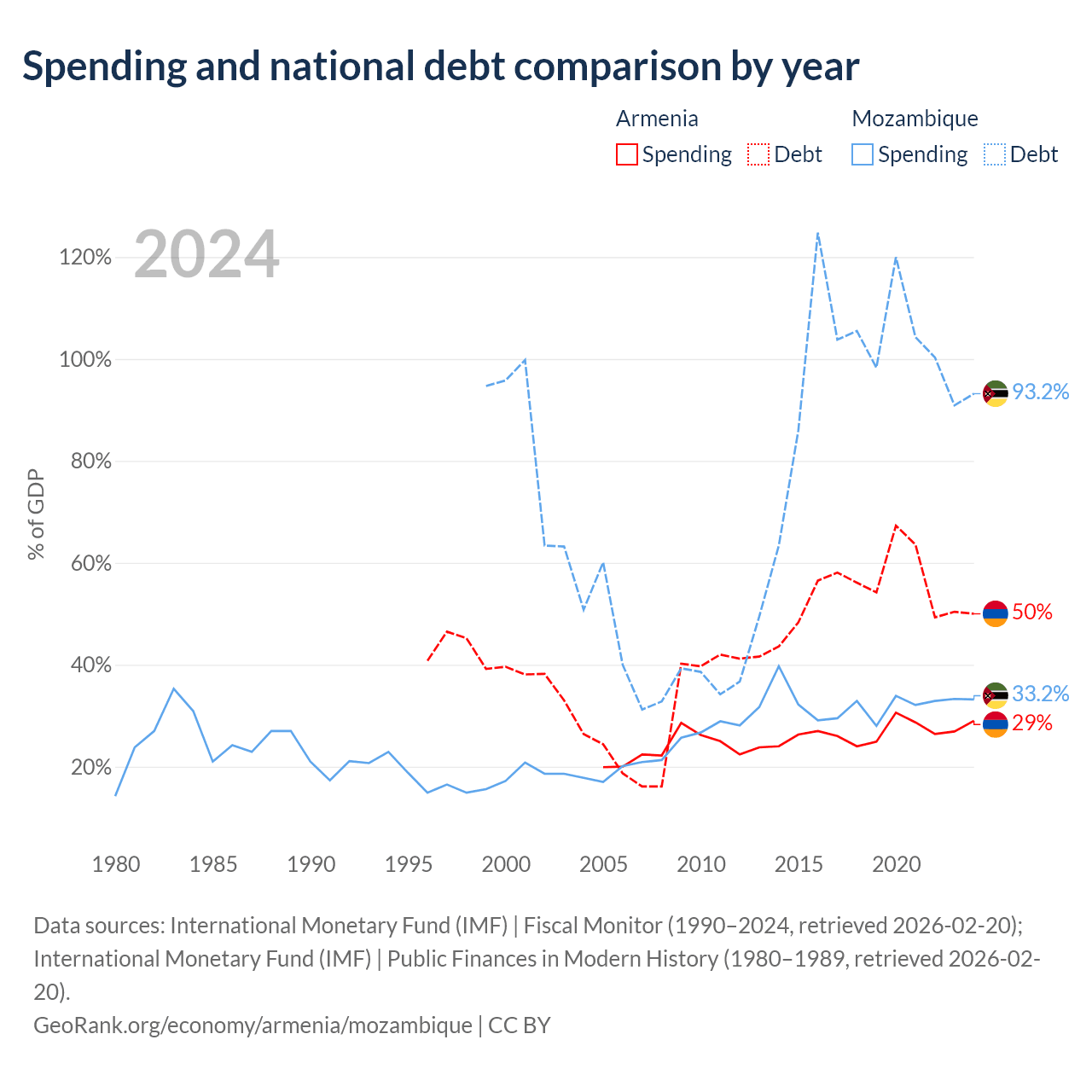 Armenia has $13B in government debt (50% of GDP), compared to $21.2B (93.2% of GDP) in Mozambique.