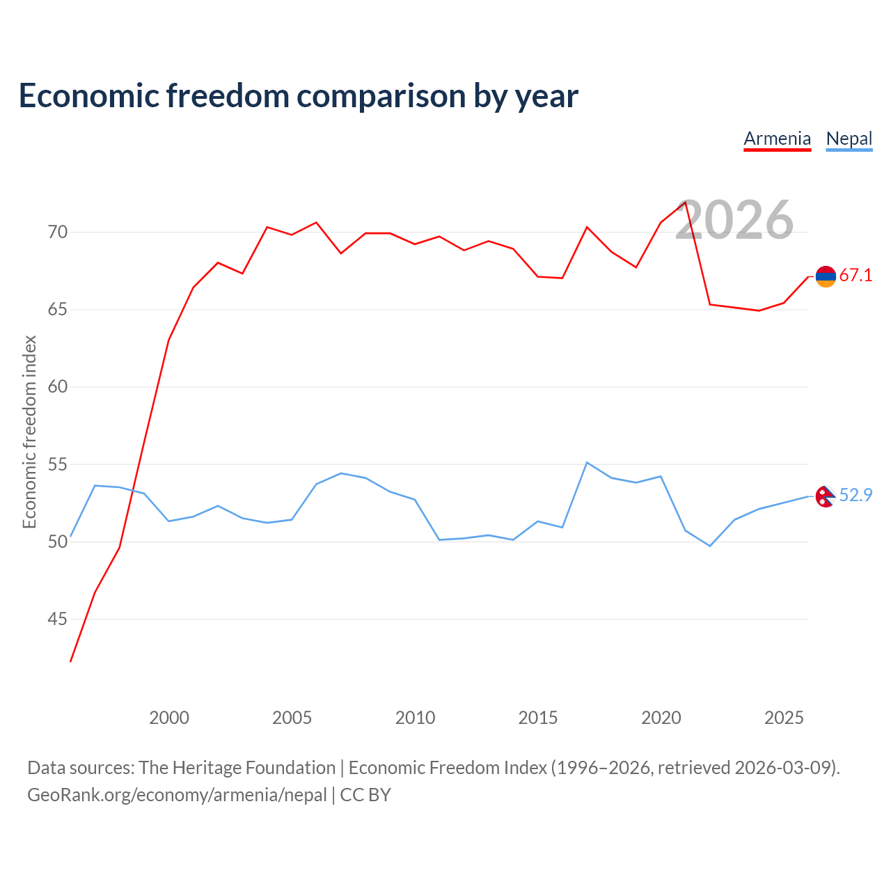 The Economic Freedom Index for Armenia is 67.1, ranking 58/197, compared to 52.9 for Nepal, ranking 144/197. The chart above displays a comparison of annual changes in economic freedom indexes.