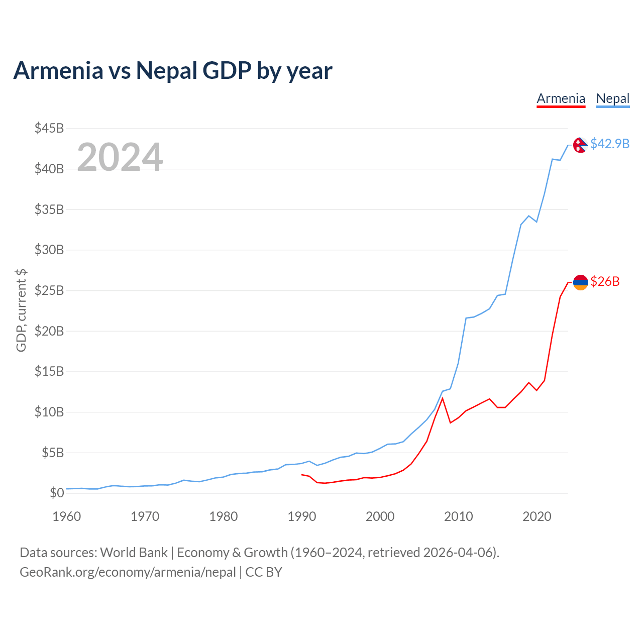 Armenia vs Nepal GDP by year