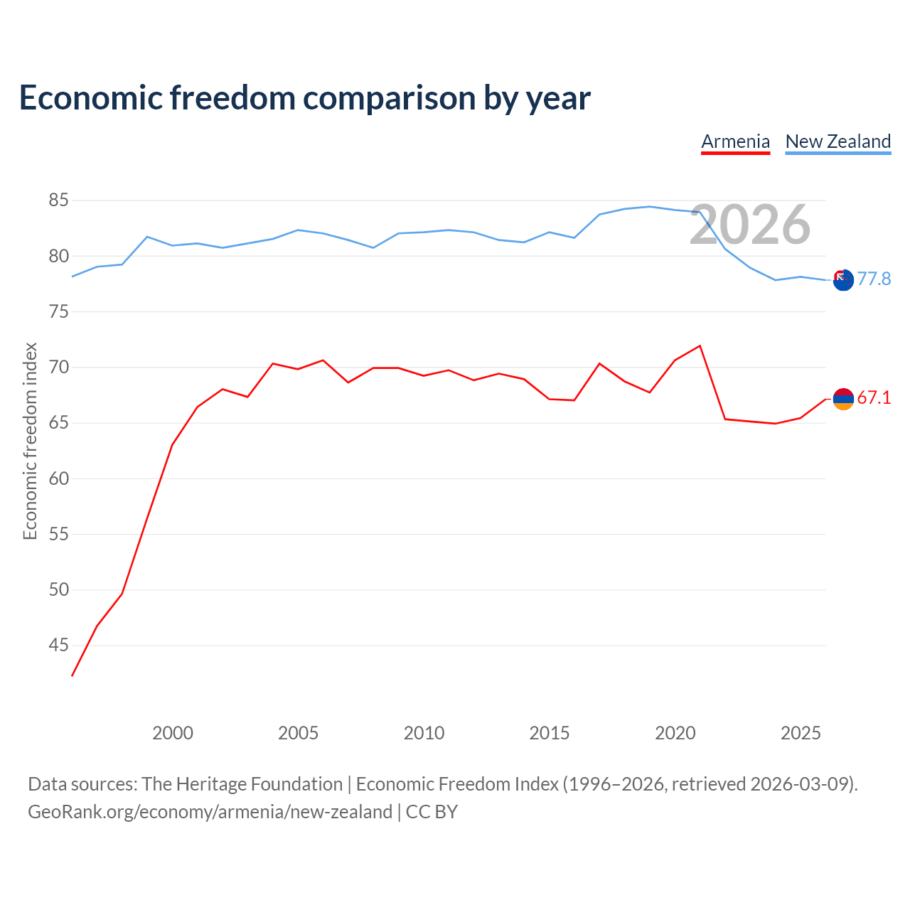 The Economic Freedom Index for Armenia is 67.1, ranking 58/197, compared to 77.8 for New Zealand, ranking 13/197. The chart above displays a comparison of annual changes in economic freedom indexes.