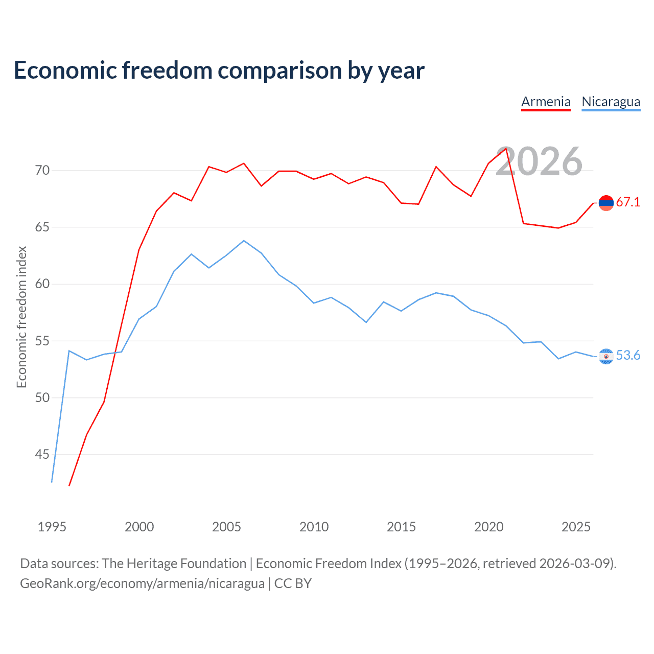 The Economic Freedom Index for Armenia is 67.1, ranking 58/197, compared to 53.6 for Nicaragua, ranking 139/197. The chart above displays a comparison of annual changes in economic freedom indexes.